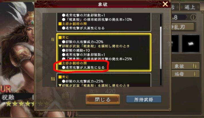 初手でダメージを出したい馬超編成の第二段。浪漫はあるのだが、最近の戦闘速度を考えればもう一声欲しい武将だと思う。色々試していくと改めて感じるのだが、使えない武将ではないと思う。