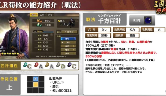 UR鄒氏が実装。地味に結構強力な技能と戦法を備えている感じです。4部隊幻惑ってのが結構強いのと、技能が星を参照にして性能アップな感じ。もしかすると、LRの育成状況次第では侍従ではなく、直接運用が必須になる可能性もある。