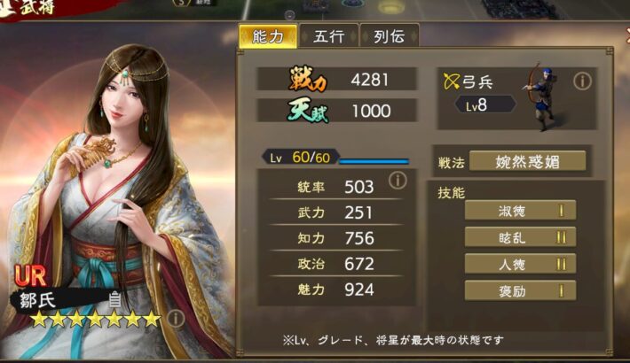 UR鄒氏が実装。地味に結構強力な技能と戦法を備えている感じです。4部隊幻惑ってのが結構強いのと、技能が星を参照にして性能アップな感じ。もしかすると、LRの育成状況次第では侍従ではなく、直接運用が必須になる可能性もある。