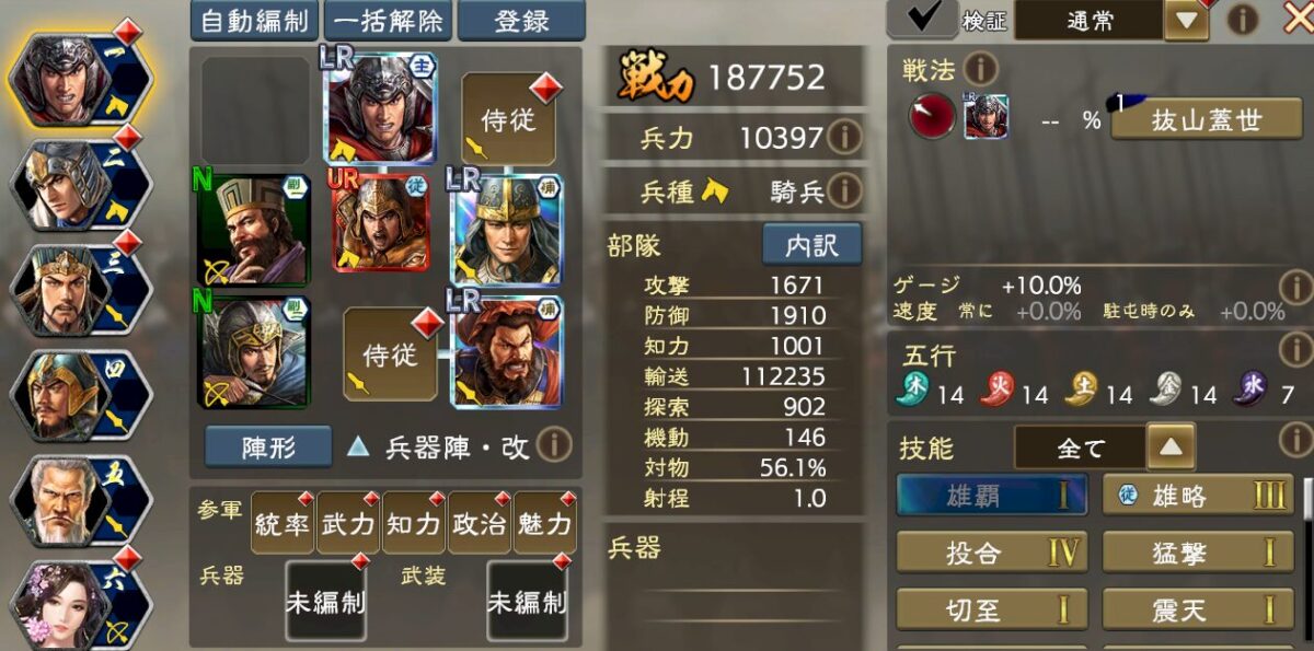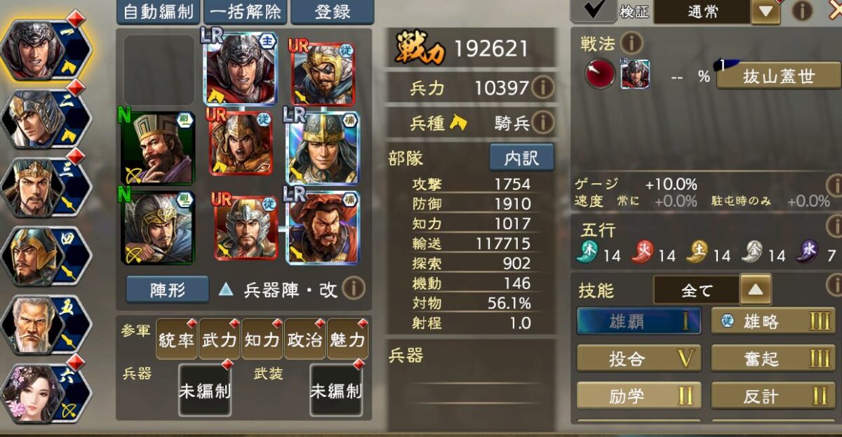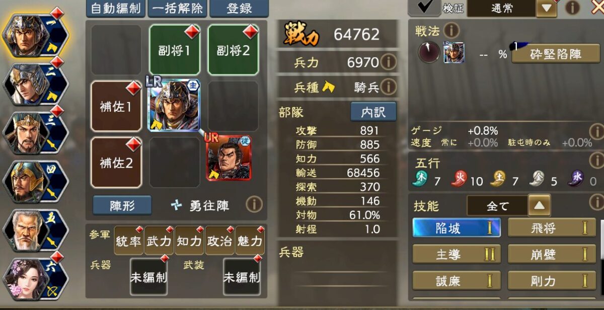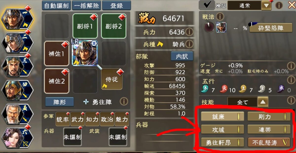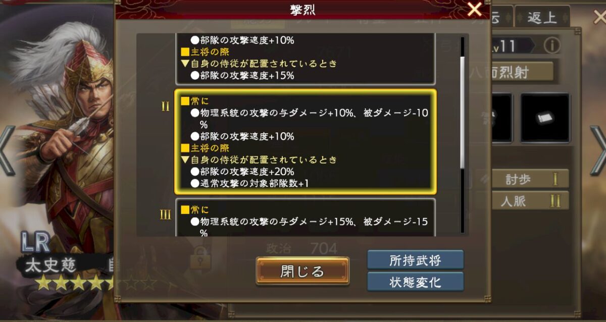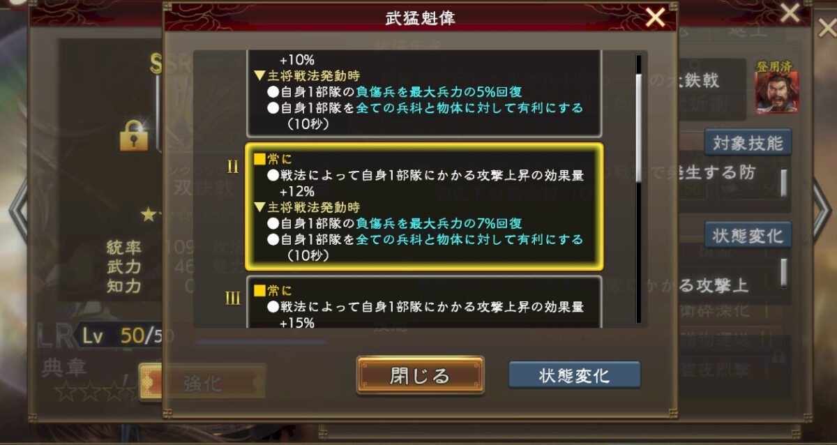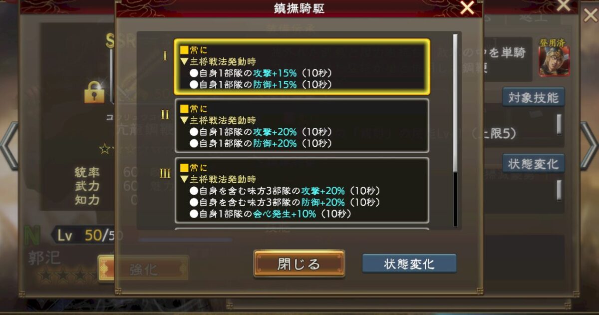 技能はこんな感じで、「常に」基礎値を大きくするので、与ダメ増技能を副将や補佐、侍従にぶち込めばダメージが大きくなる、というイメージです。