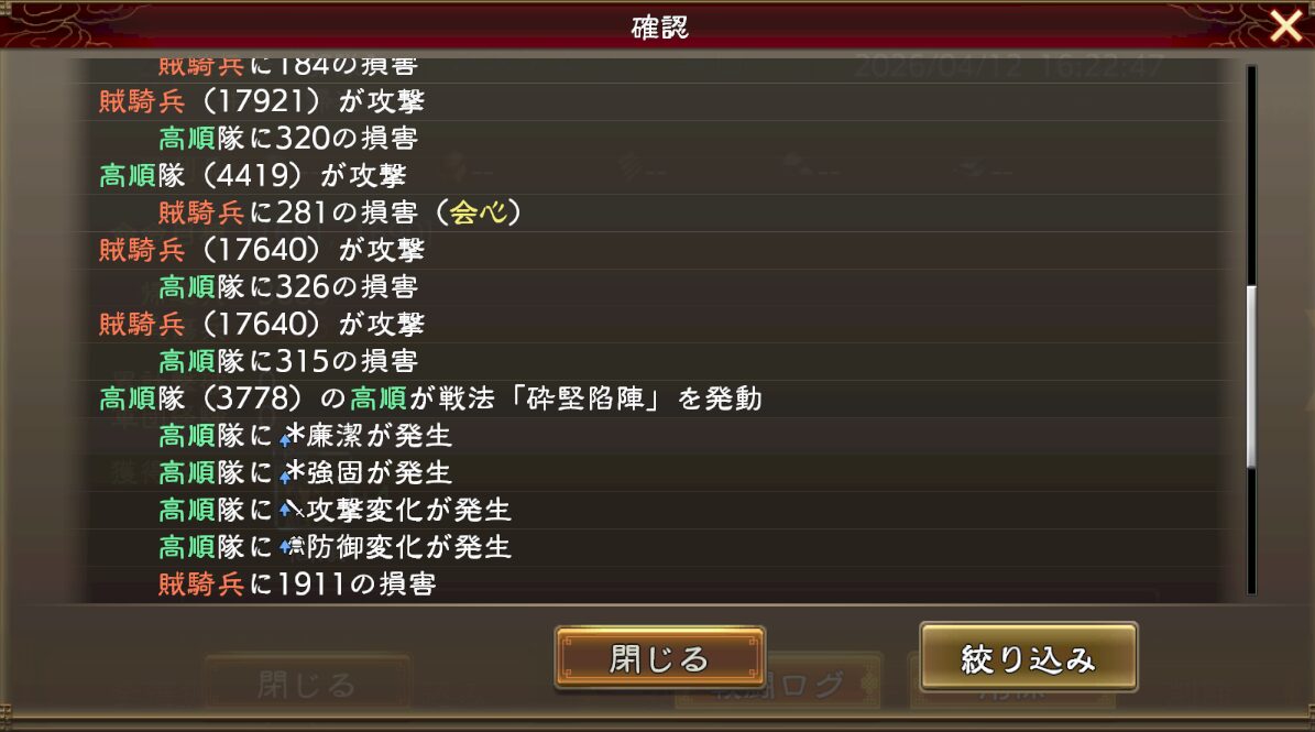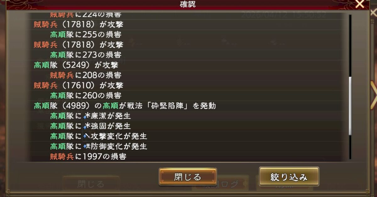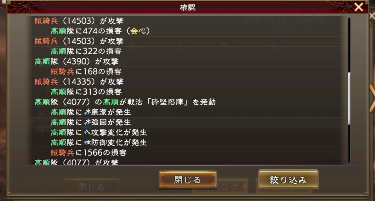 あとは名宝や技能、戦法に書かれてる数字を全部かければ、大体の最終倍率ってのは想像が付きます。今回みたいに1割ぐらい低かったり高かったりしますけど、100万ダメージを想定していて1万しか出ませんでした、みたいにはなりません。