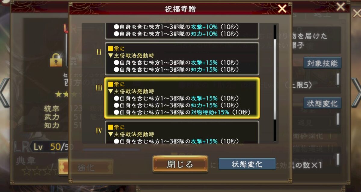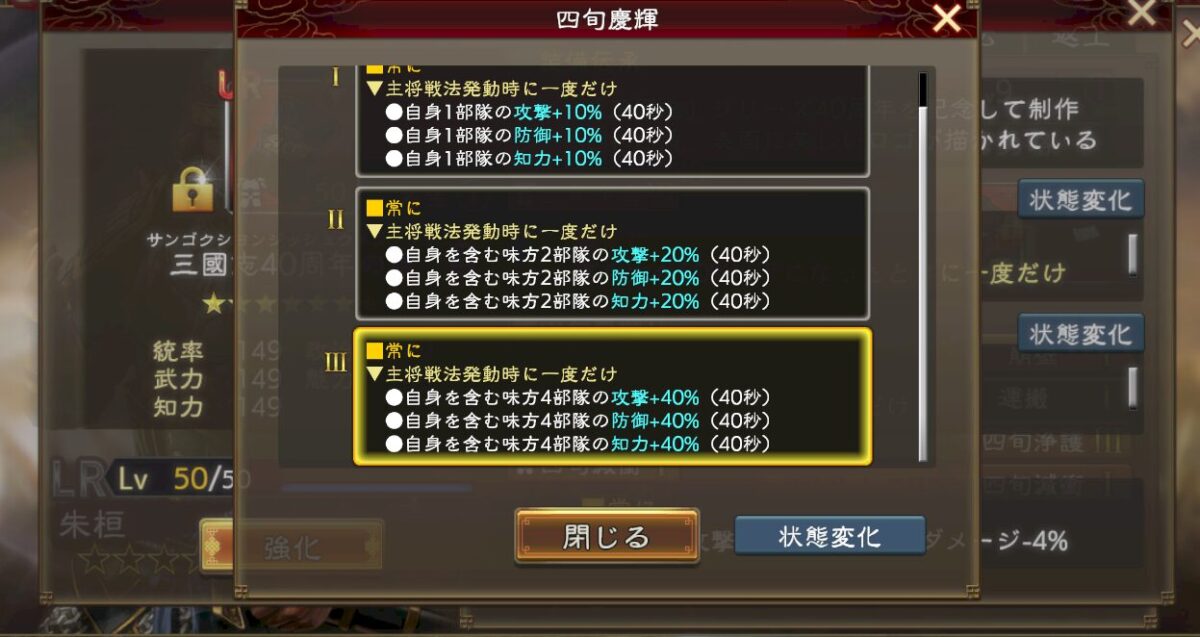 項羽や白起などの一部武将の能力でのみ、事実上の上限解放が発生するバフ。基本的に重ね掛けは不可能なので、戦法や技能の文言に書かれている通りの数字が上限だと考えて良い。