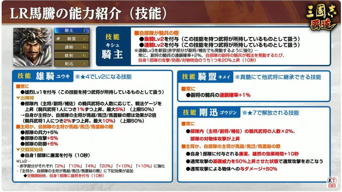 また馬騰が主将の際は、このバフ効果が自身を除く味方騎兵3部隊にも付与されるようになる。ただこの効果、勘違いポイントなので注意