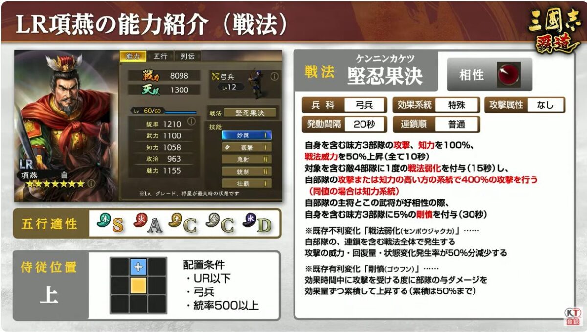 また自身の主将とこの武将が好相性の場合、自身含む3部隊に5%の剛憤を付与する。このバフはLR魏延が持つバフと同じ。