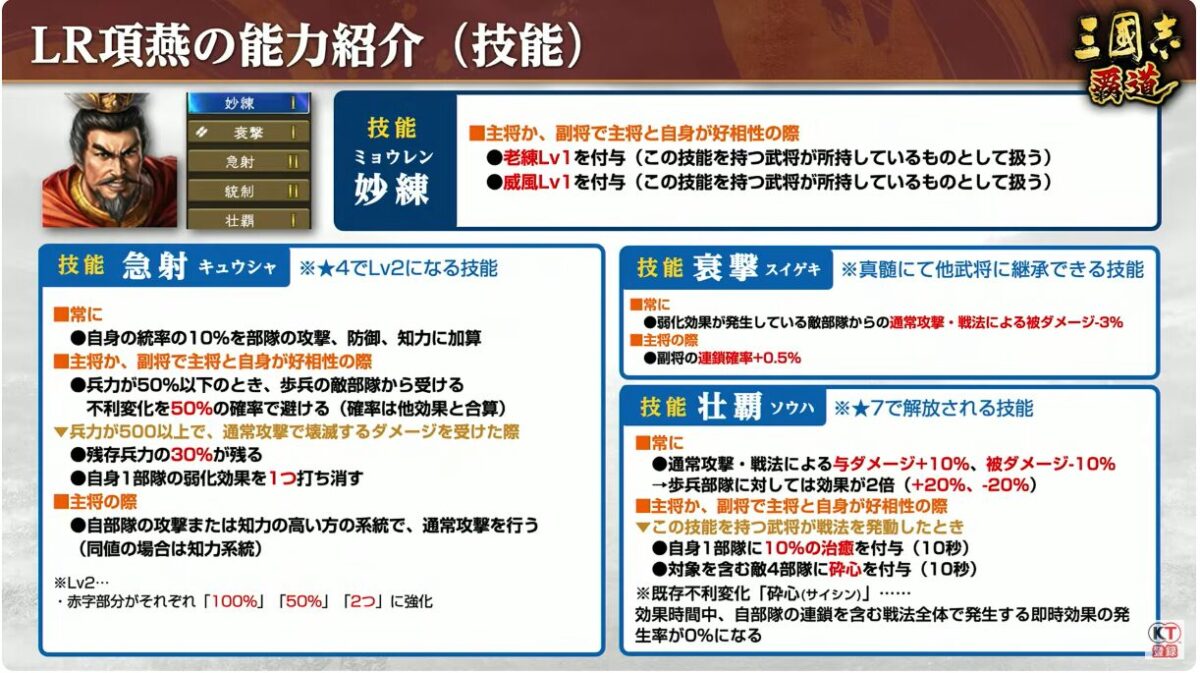 主将か、副将で主将と自身が好相性の時、歩兵の敵部隊から受ける不利変化を50%の確率で避ける。なんでこんなくだらない条件付けたし。曹操意識しすぎ問題。