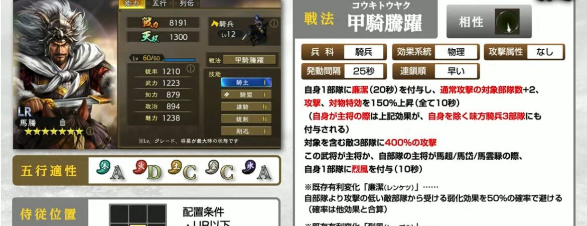 雄烈1を付与し、出陣時に部隊内の騎兵1人つき1%のゲージ増加を行う。この効果は自身が主将、もしくは馬家が主将の場合は効果量が2倍になる。基礎値5%のマックス10%。