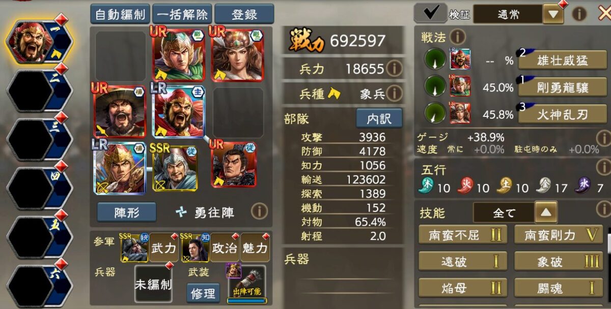 筆者の場合は主将が張飛。つまり本来想定の馬超ではないので、雄烈が発動していないので、与ダメ増に関係してくる意味がある技能変えた感じです。今回は物理与ダメ増の太史慈に積んで条件も満たしやすい麴義を採用。遠破凄いですね(与ダメ+15%)