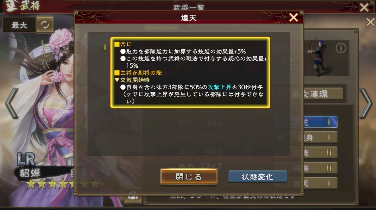 つまりLR貂蝉の完凸技能であるこれは、交戦開始時に攻撃バフ50%発生させるのでかなりの強技能って事になります。バフの発生条件に好相性縛りもないので、埋めにくい勇往陣の左上を埋められるのもグッド。
