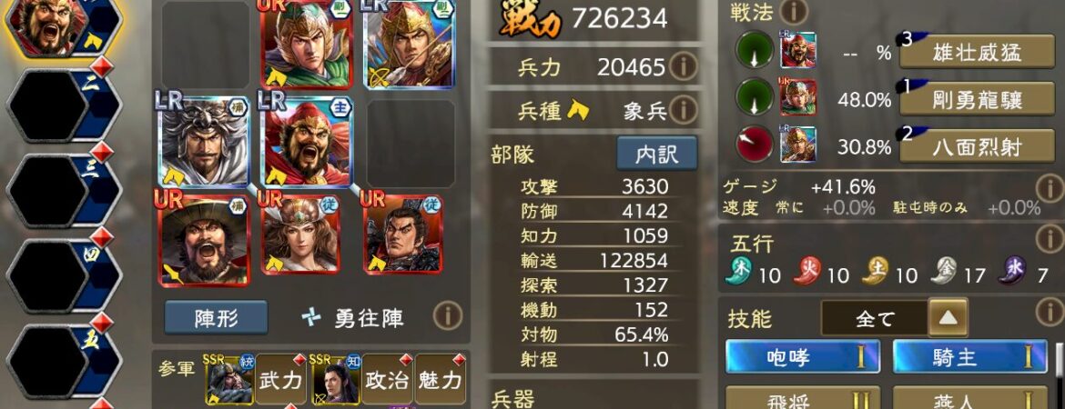 筆者の場合は主将が張飛。つまり本来想定の馬超ではないので、雄烈が発動していないので、与ダメ増に関係してくる意味がある技能変えた感じです。今回は物理与ダメ増の太史慈に積んで条件も満たしやすい麴義を採用。遠破凄いですね(与ダメ+15%)