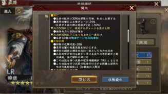 更に通常攻撃や戦法の与ダメが増え、被ダメが減る。加えて道断が付与されていたらここの効果が2倍に。道断付与されているって前提で、星4までなら10%で、星4以降は20%。また兵力50%以下の際に戦法ゲージが30%増加する。星4なら50%増加する。