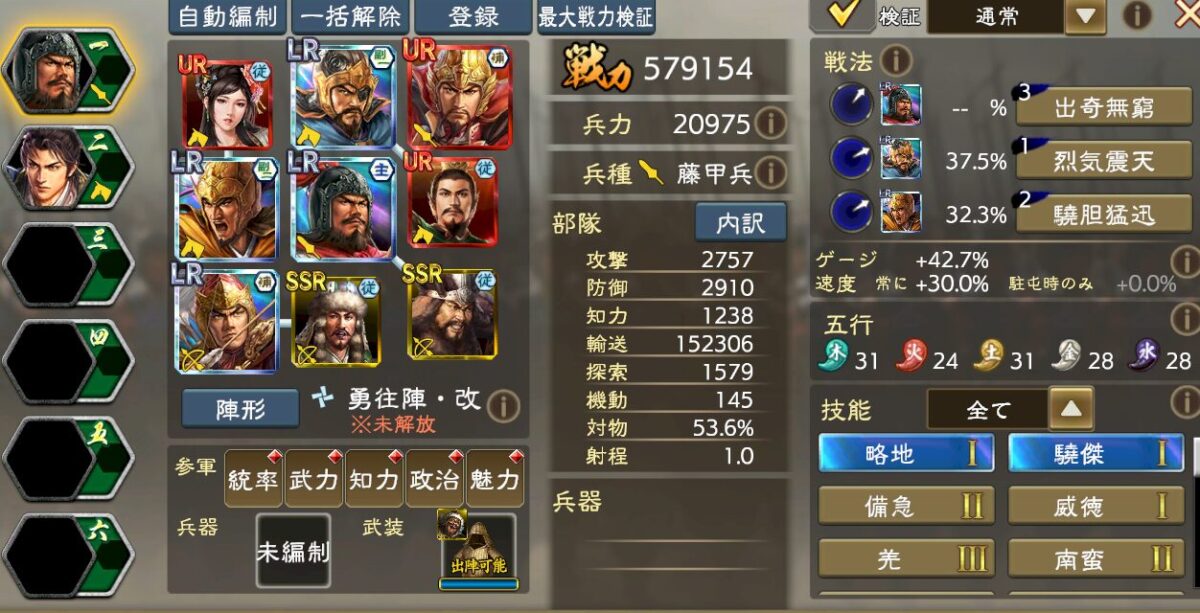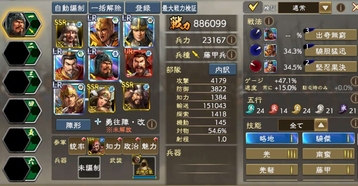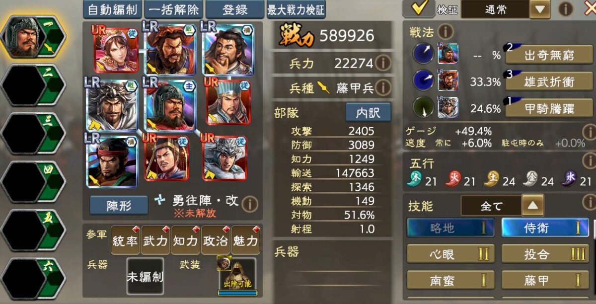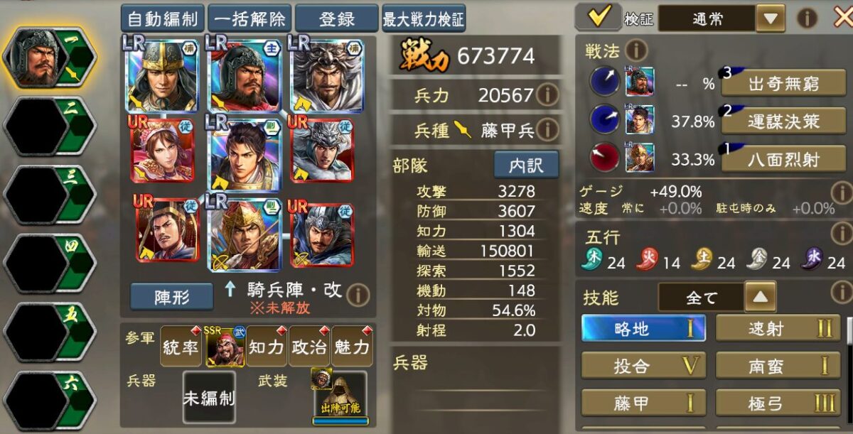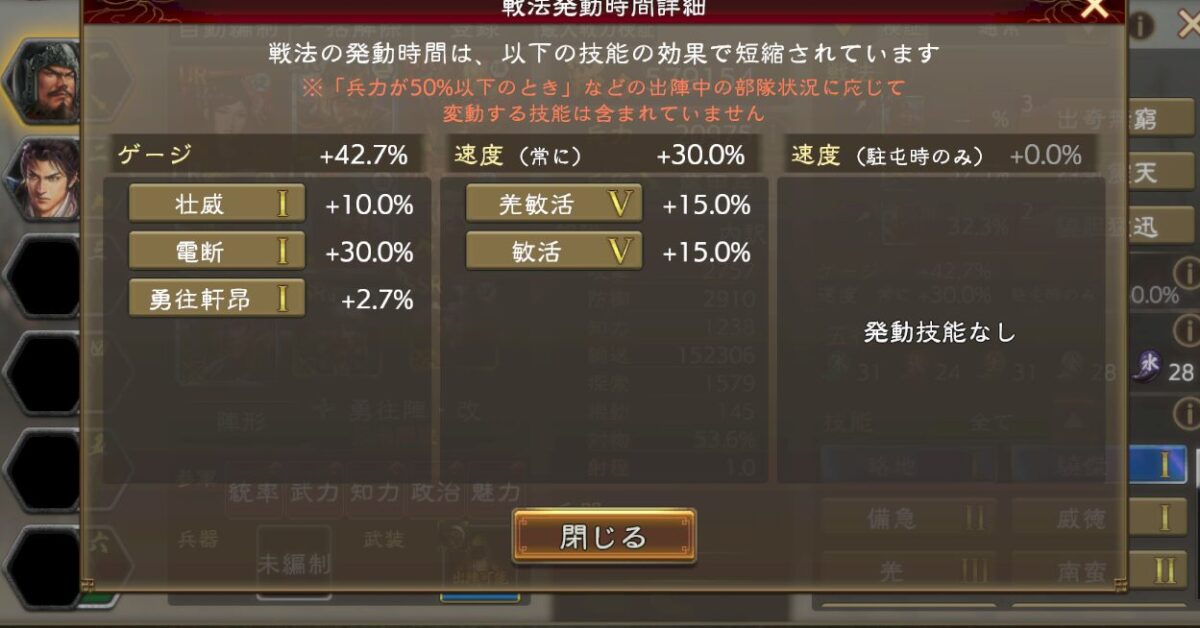 ゲージ短縮と戦法ゲージ増加を積みつつ、勇往陣改という課金陣形も必要になります。参軍張飛で出陣時ゲージは48%まで盛れますが、ゲージ増加系の名宝があれば50%も行けます。