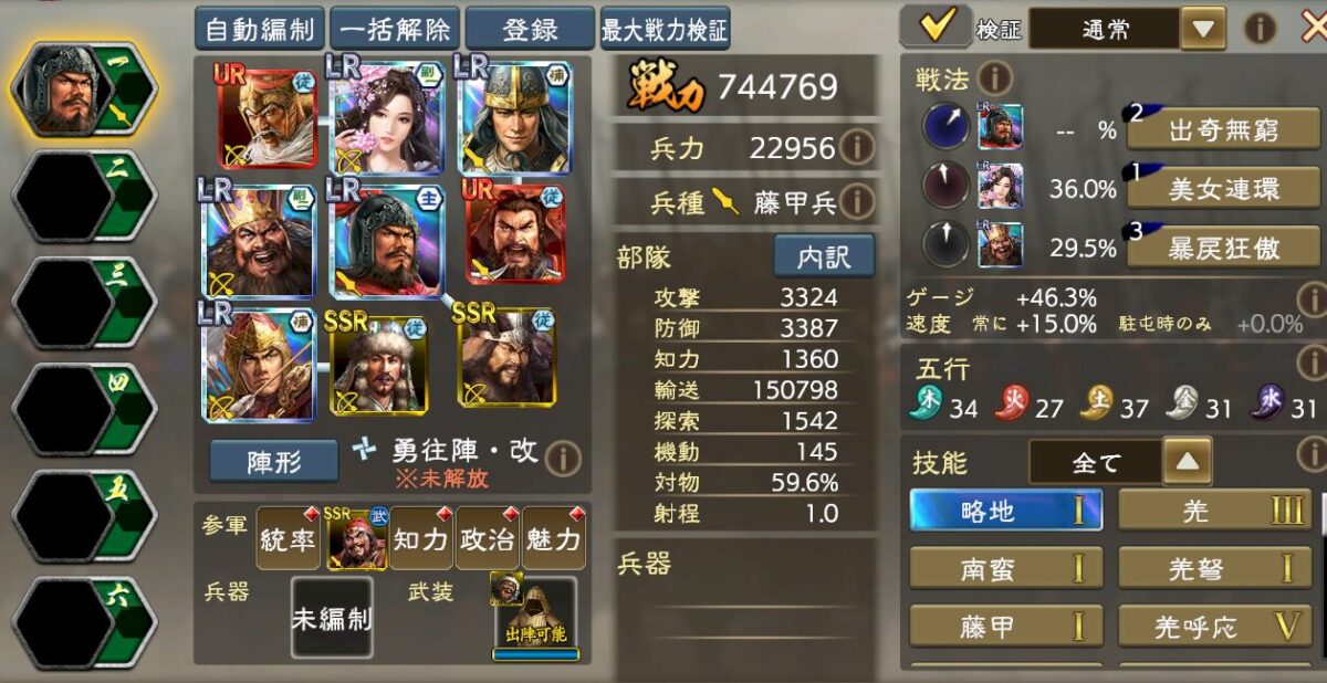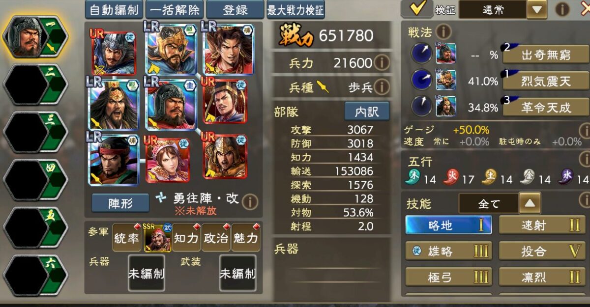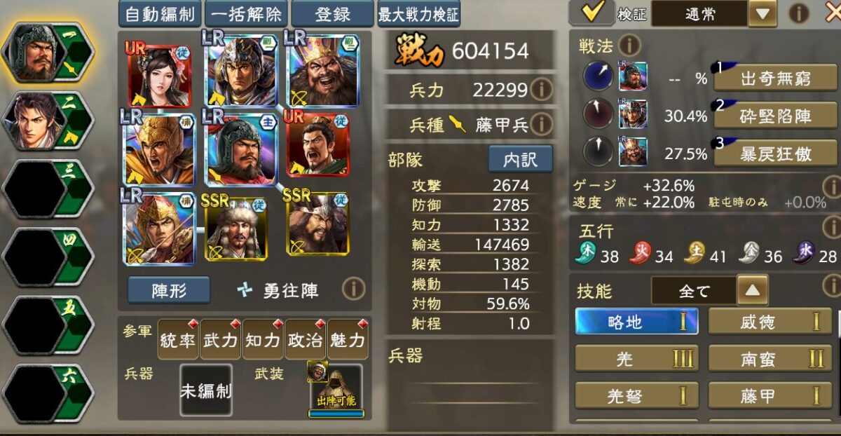 出陣時ゲージと雄烈の兼ね合いを取りLR馬騰を採用してますが、馬騰の場所は自由枠なのでオリジンズ張飛でもチョウコウでも即死耐性系の武将でも、何でも自由に入れてください。