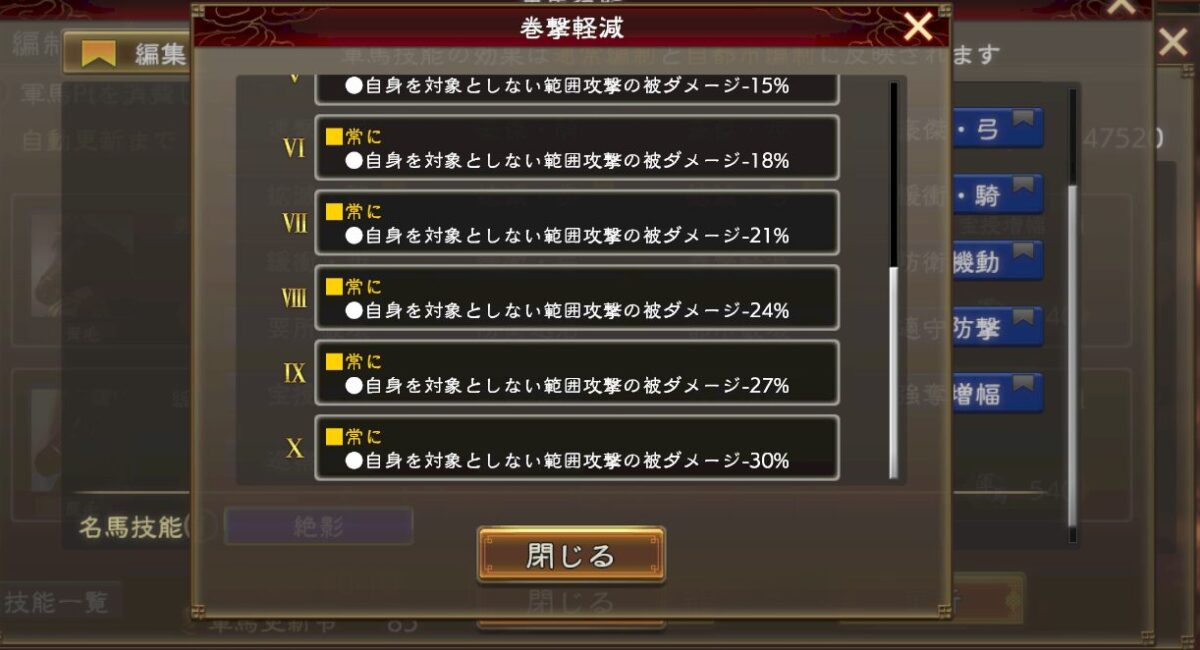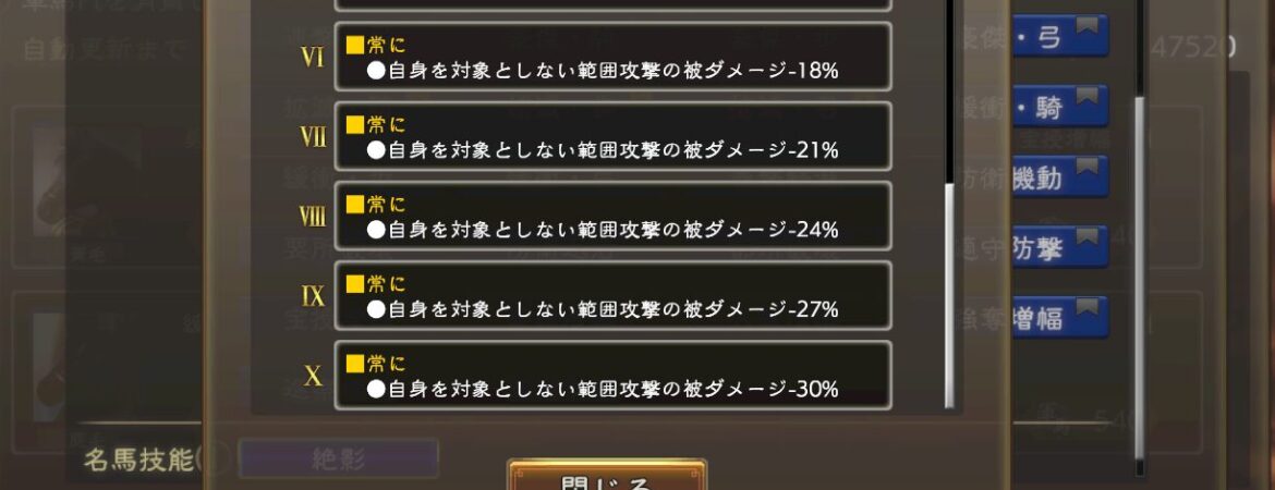 全てのダメージが無条件50%減とか、ぶっちゃけあり得ないです。全員LR馬超の強勢技能持ってるようなもんです。ちょっと効果量がおかしいです。