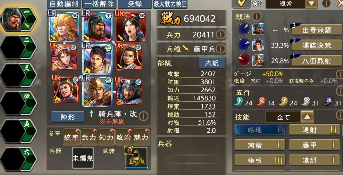 UR呂玲綺麗がステータス低くないので、呂玲綺を補佐2に入れて、朱桓のところにUR諸葛亮などの敏活+耐性持ち武将を入れても良いですし、UR于禁、UR徐晃、URチョウコウなどの「歴戦」技能持ちを入れても良いと思います。ここも兵科有利時の与ダメ被ダメ有利系の技能です。
