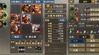 要するに廉頗の単発19.5倍の戦法をどうやって30倍近くにするのか、て事に1つ壁があり。通常攻撃で1000ぐらいのダメージを出せるステータスで運用できるのか、て事に2つ目の壁があると思う。そして最後に、そこからダメを上積みするための副将をどうするの、て問題がどうしてもついてくる。