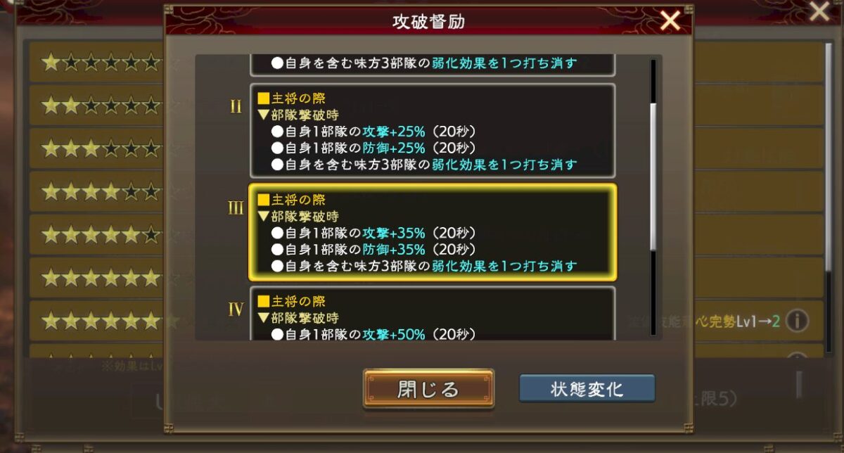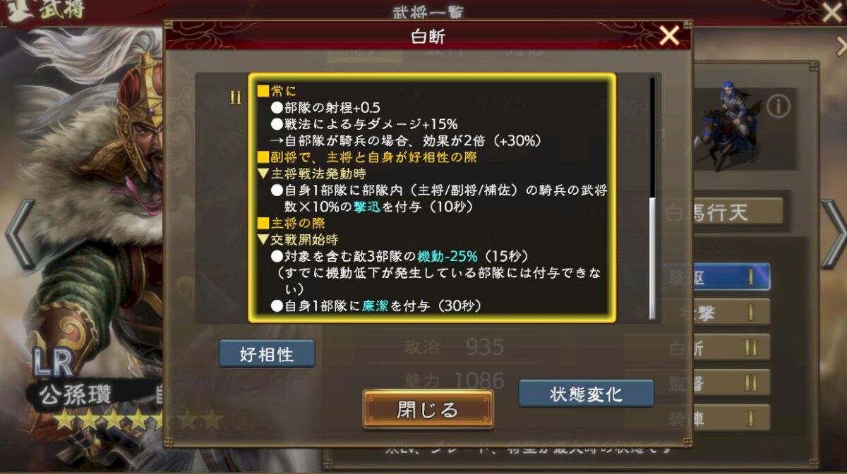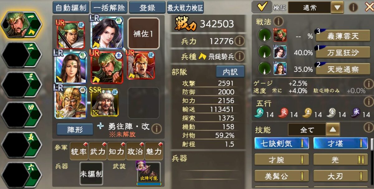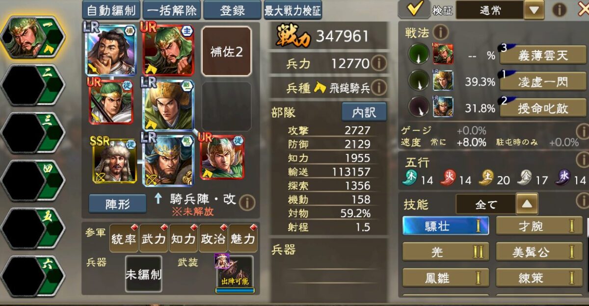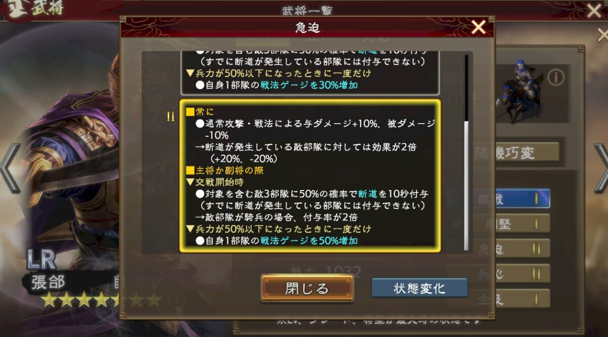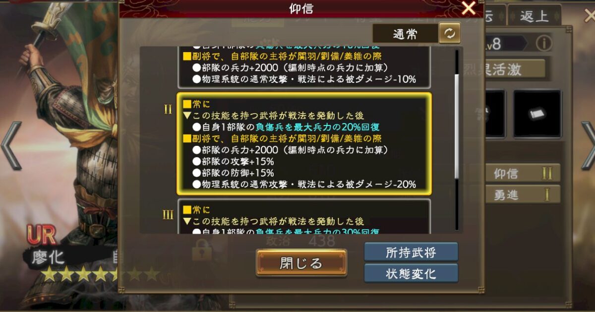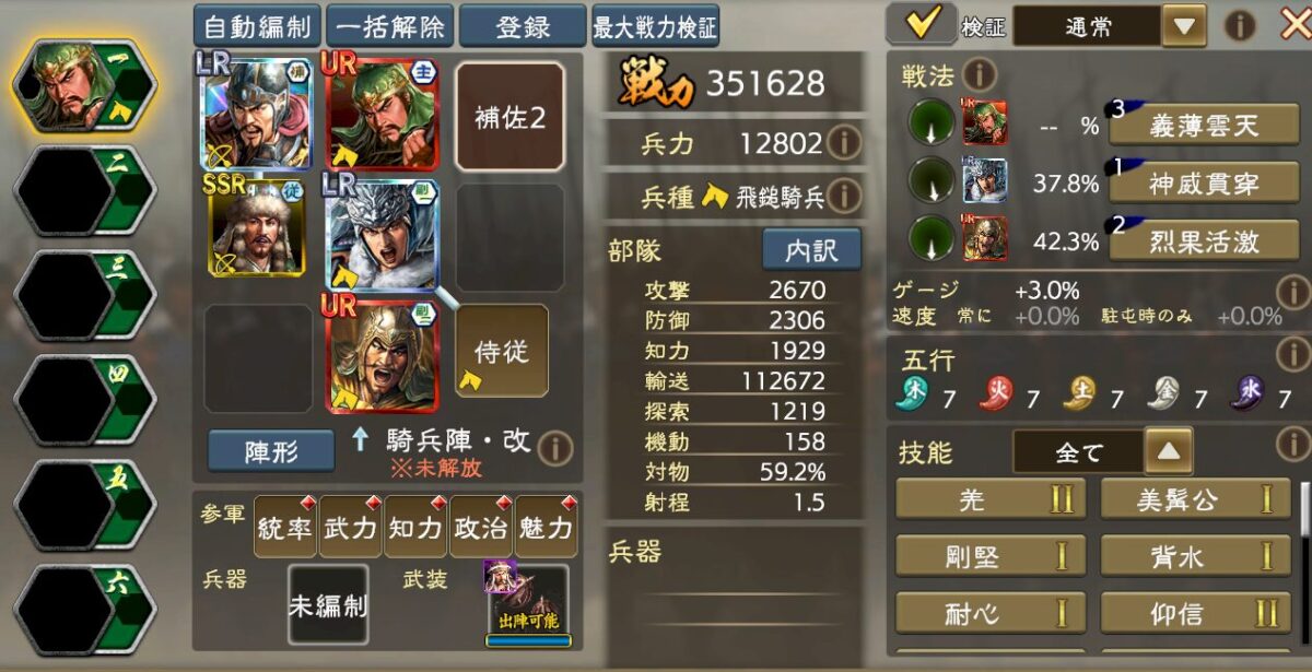 基本的に通常攻撃ではなく戦法火力を上げる編成になる感じなので、よい感じに。UR関興の技能である壮気は副将2の際には戦法火力を上げられます。普通に淩統とかでも良いんですけど、お好みで。