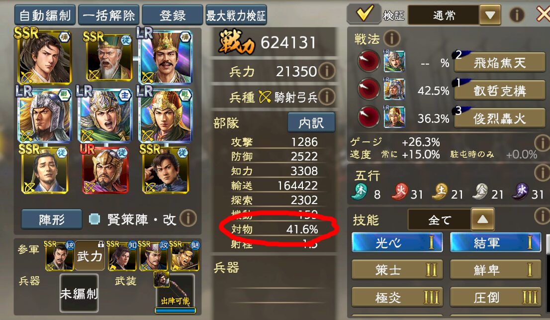 ここで足りてない30万を乗せるために、残りの3部隊で ①攻撃部隊より早くバフ入れる先手必勝の戦法型で部隊を組んだり、②攻撃速度と会心発生を持たせる後打ち可能なバフで対応したり するわけです。