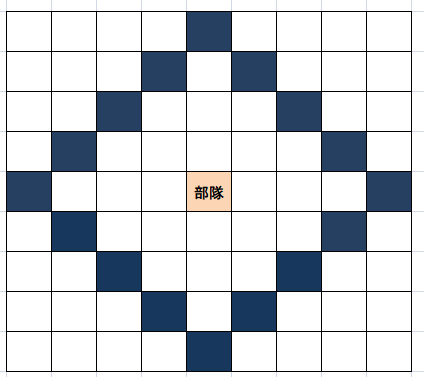 なので、射程4部隊の実際の攻撃開始範囲ってのはこんな感じになります。