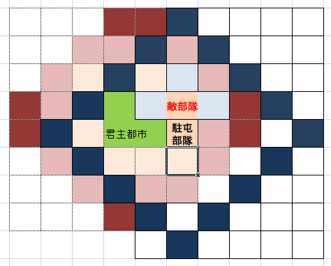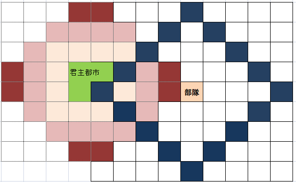 駐屯部隊が展開するのは君主都市の外周になるので、基本的に射程1の位置に駐屯部隊は居ると思ってください(正確には0.5とかでしょうけど、イメージが伝われば良いです)
