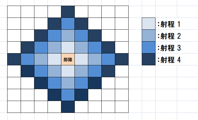 射程4の部隊の攻撃範囲はどうなっていますか? と聞けば、この色分けしている区画全てを攻撃できるように感じます。ですが、実際には射程4の色分けをしている部分でしか交戦を開始しません。ちなみに交戦を開始しないだけで、交戦開始すれば射程内でも攻撃はします。ややこしいですね。