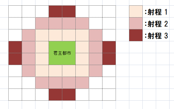 逆に君主都市とか拠点、攻城要所みたいな、攻撃対象のマスが小さい場所を守ろうとした場合、射程を伸ばし過ぎると初動が遅くなる可能性が出てくる、って感じになります。