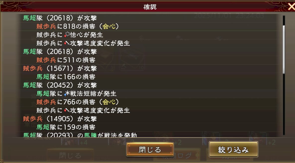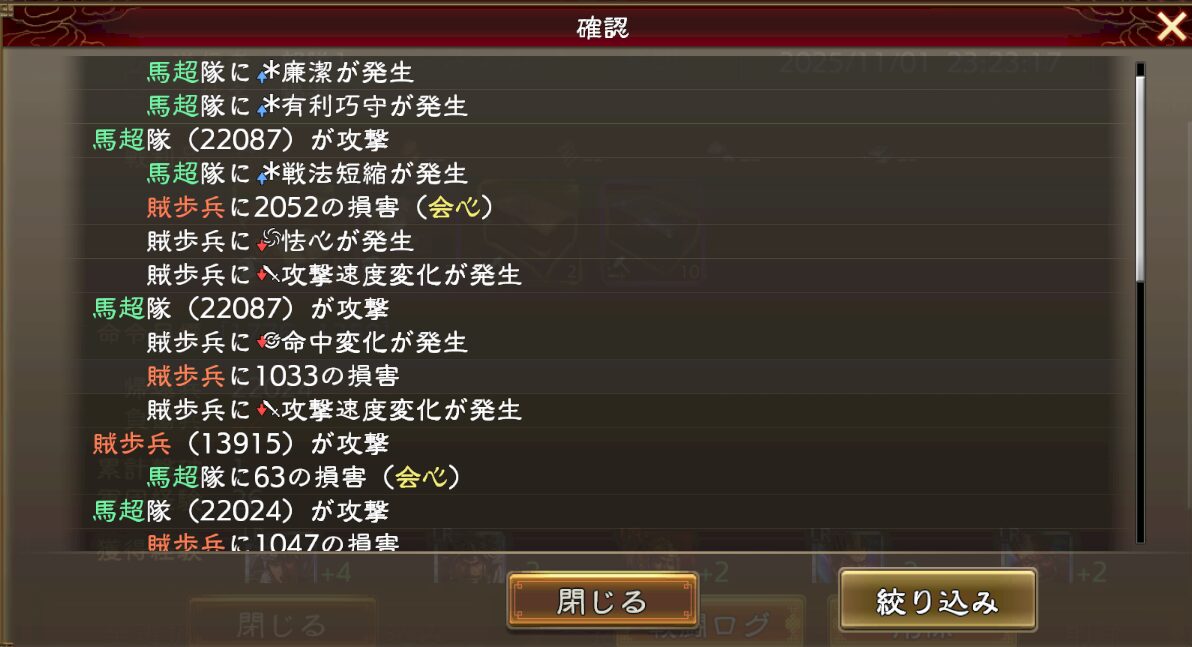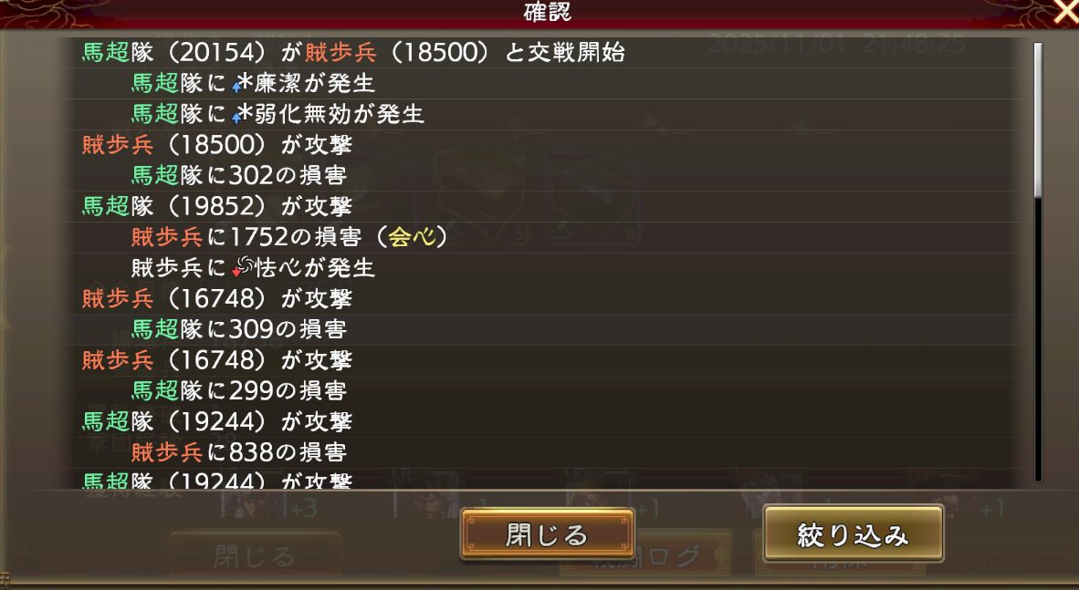 呂布外した編成。要するに全兵科有利が消えてる部隊のログです。