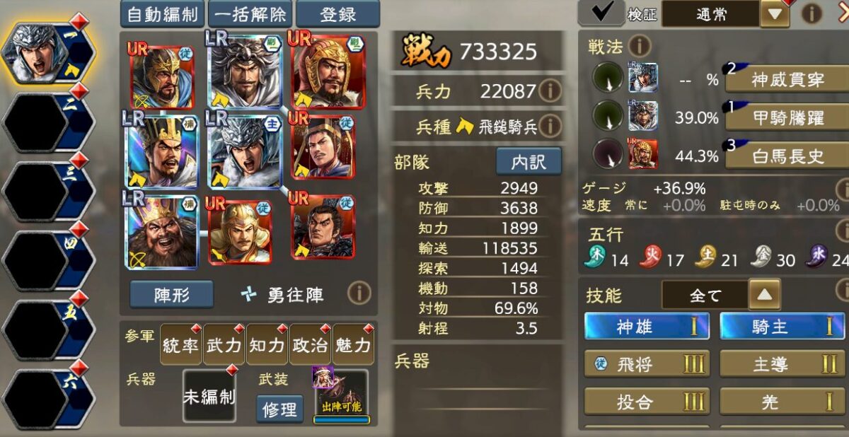 総括として、どんな編成が良いのか、を考察。攻めと守り両方で乗せました。まあ先に結論言えば、どっちもLR馬超なんですけども。