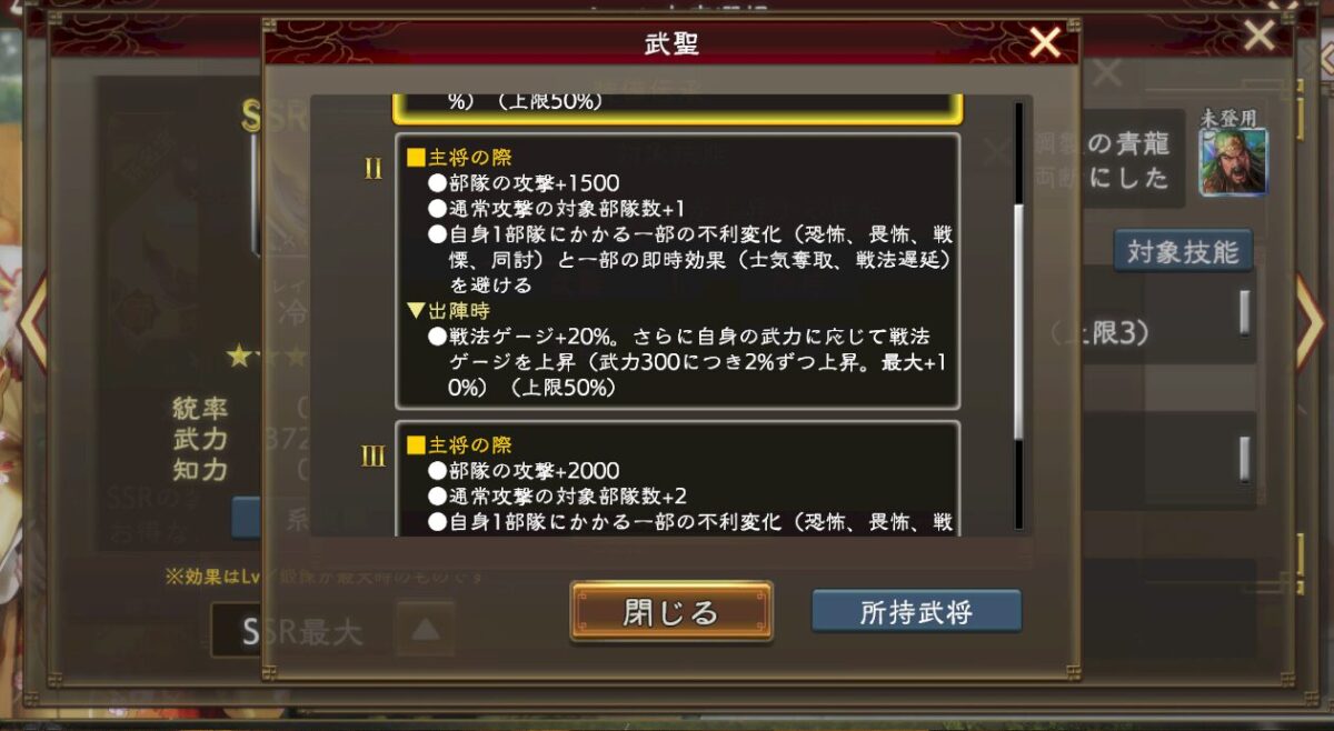 3部隊に600%攻撃。主将の際には、敵の取り込み、攻撃無効、不退、不滅を無視してダメージを与える。