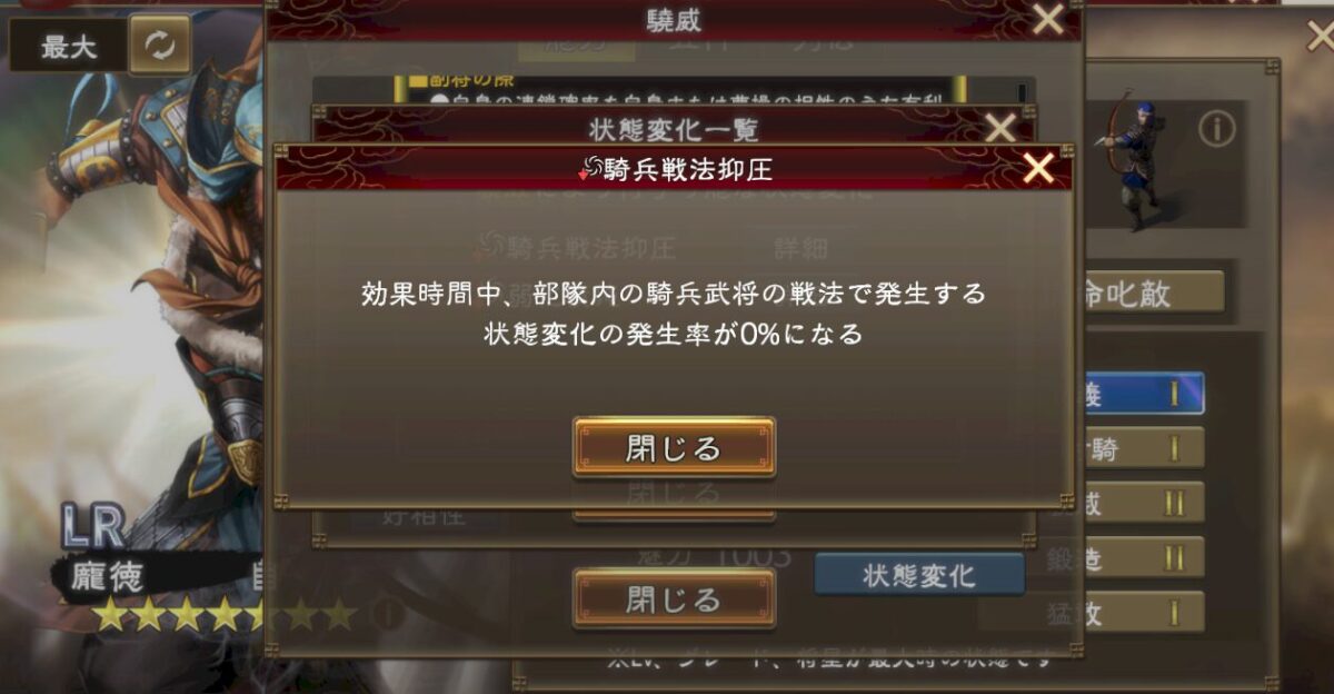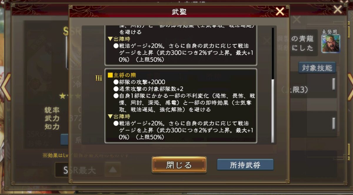 畏武が3部隊になるのも結構大きいのですが、戦法でダメージを与えた際に敵の即死耐性を無視できるのがめちゃくちゃ強いです(最大3部隊までとかほざいてますけど、そもそも戦法範囲って4部隊がMAXです)