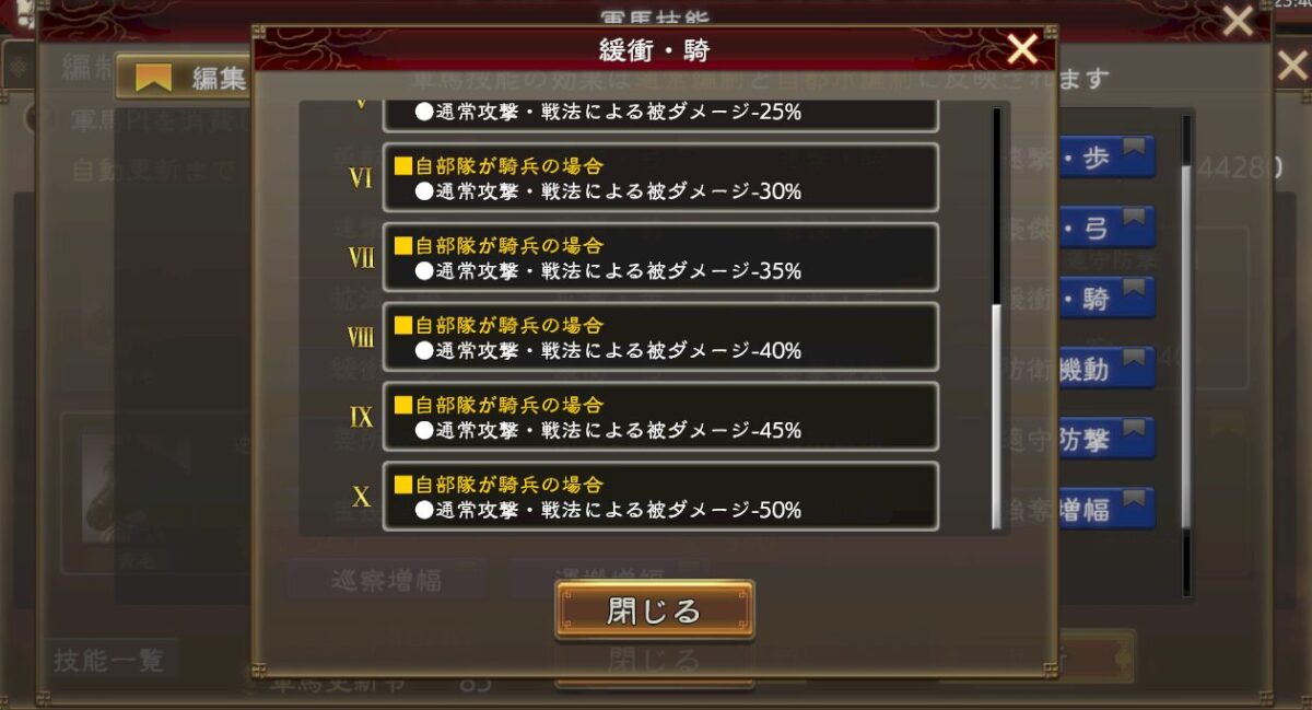 騎兵から受ける物理ダメージは9%なので、10万くらうはずでも0.9万まで減らせます。これなら流石に死なない。