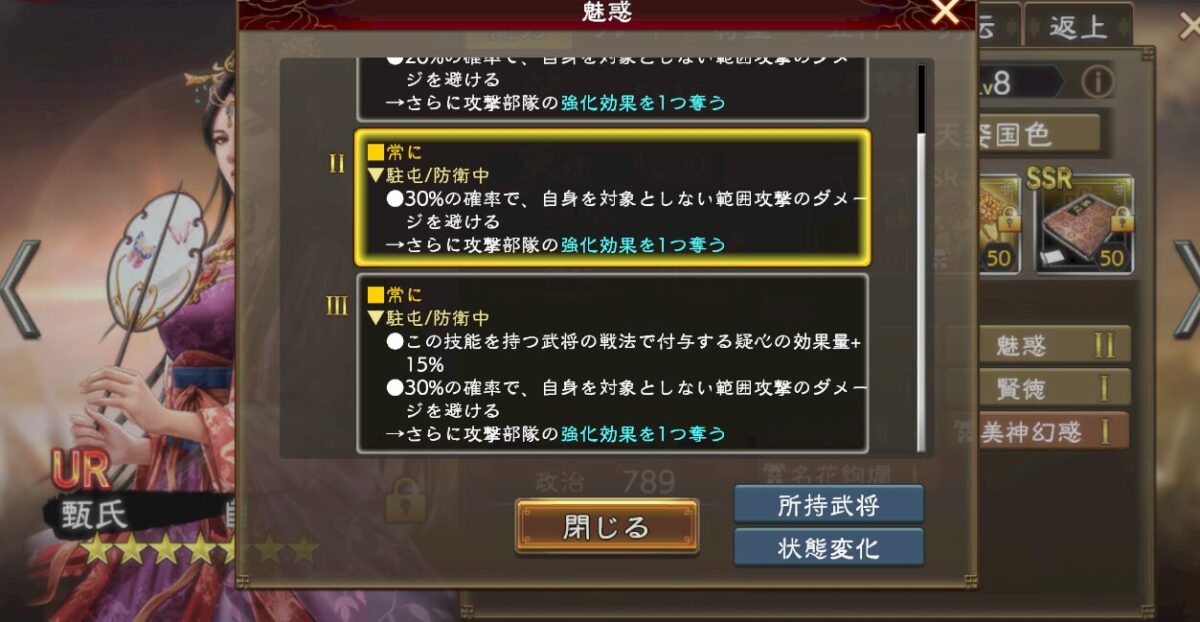 この魅惑はUR甄氏とLR甄氏がそれぞれ備えているので、2部隊に組み込むことも可能です。