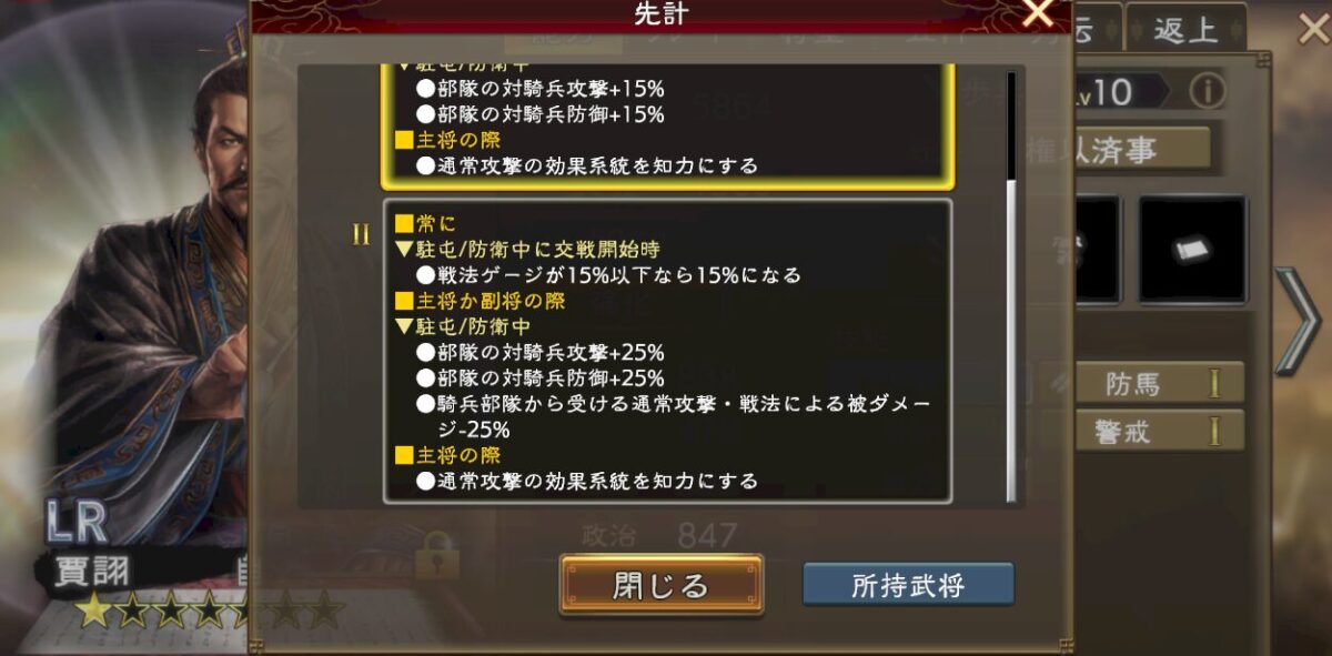 LR賈詡の対騎兵防御、騎兵からの通常攻撃・戦法ダメ軽減はそれぞれ25%。