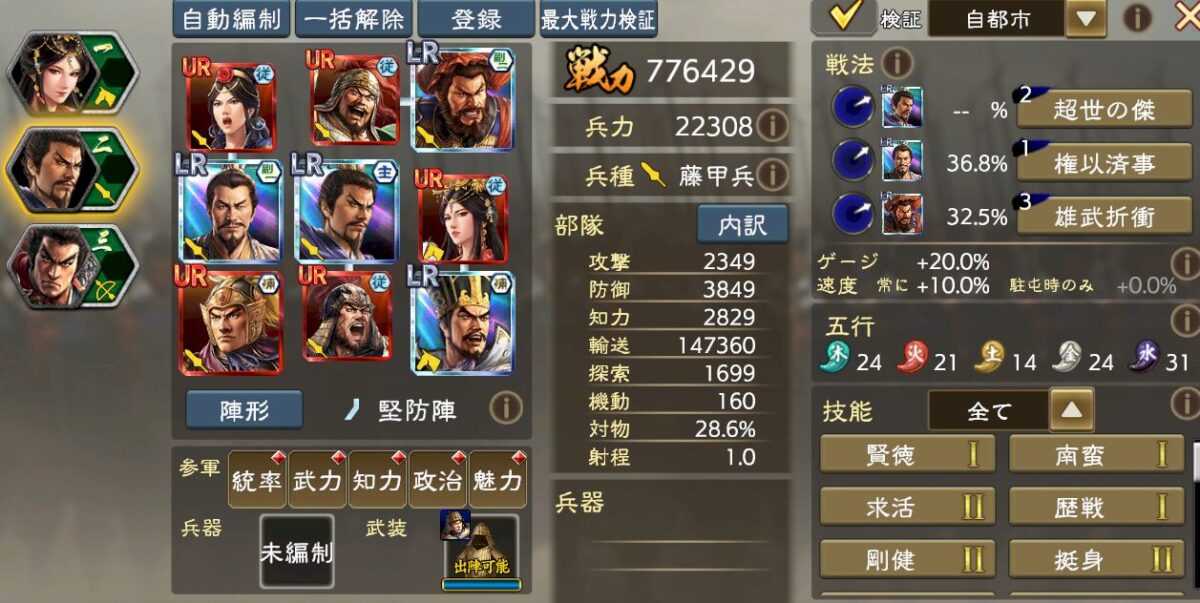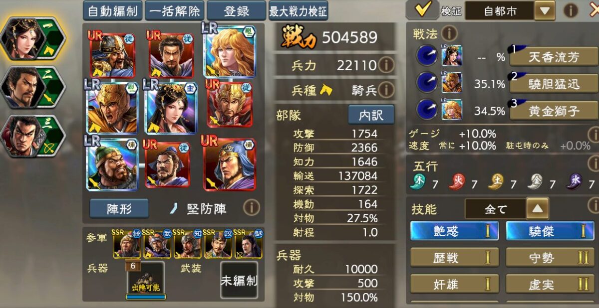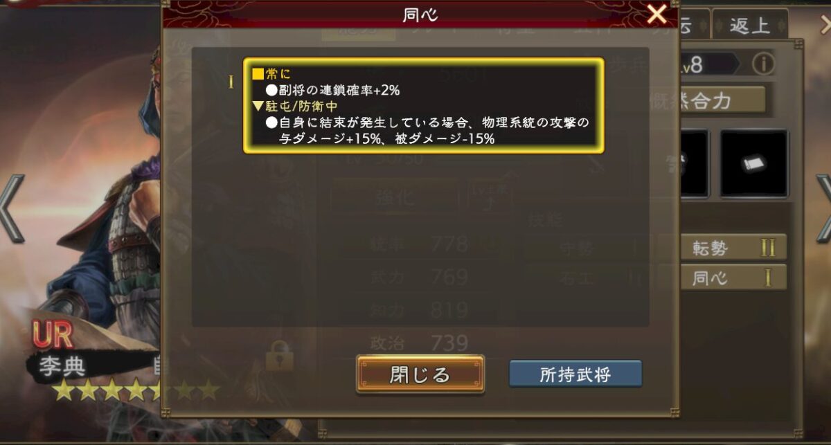 これなら無理なくLR許チョを副将に収める事ができるので物理戦法からの耐性も高いですし、オリジンズ夏侯惇の巻き込み耐性10%(MAX20%)や威風などの兵力盛り、UR程普の老健など、よりスムーズに技能が噛み合ってきます。