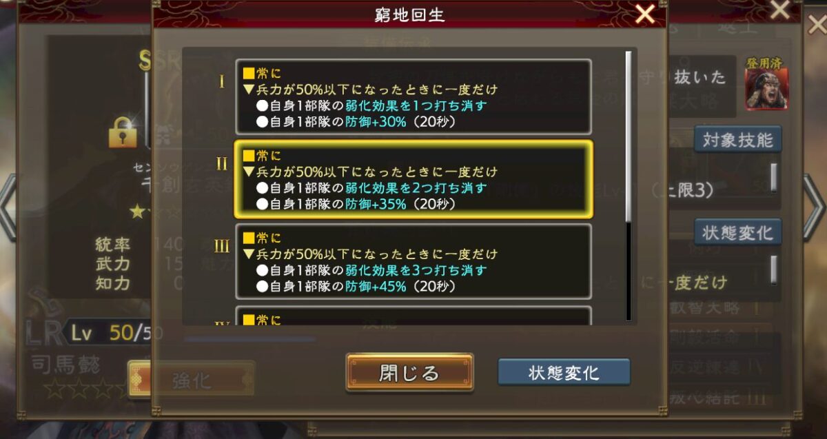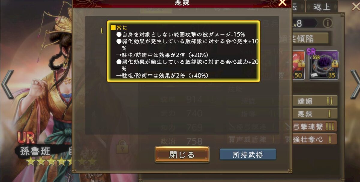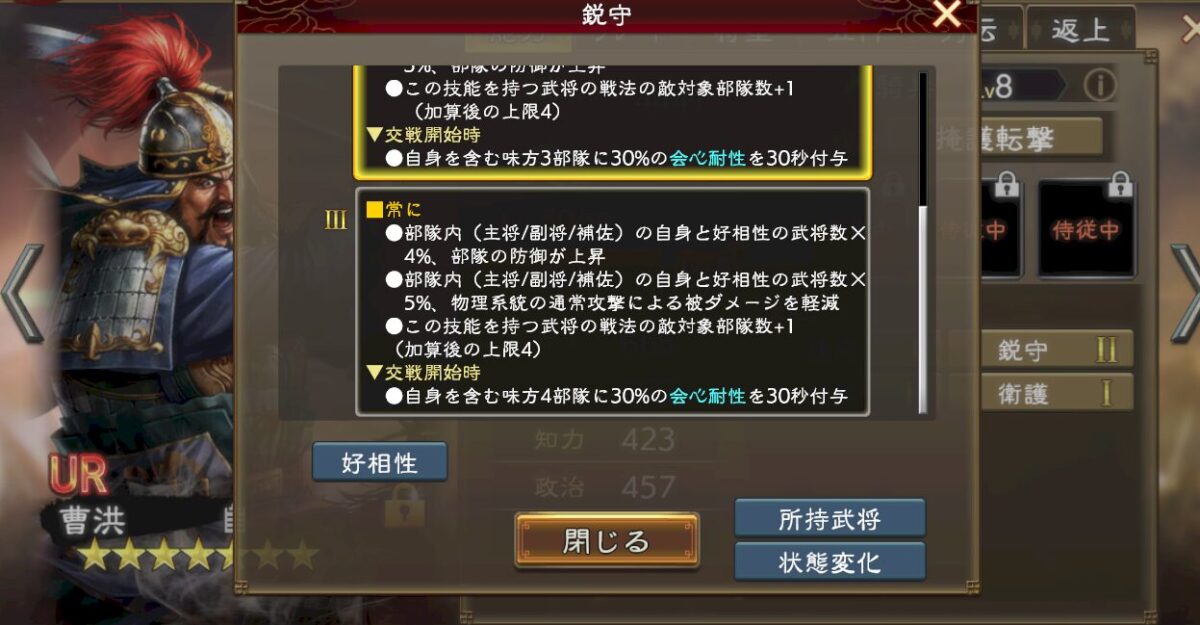 曹操の侍従に据えたUR周泰の技能「剛健」の効果で戦法範囲を狭くしつつ、強化奪取や4部隊への3回絶縁をぶん回せる。