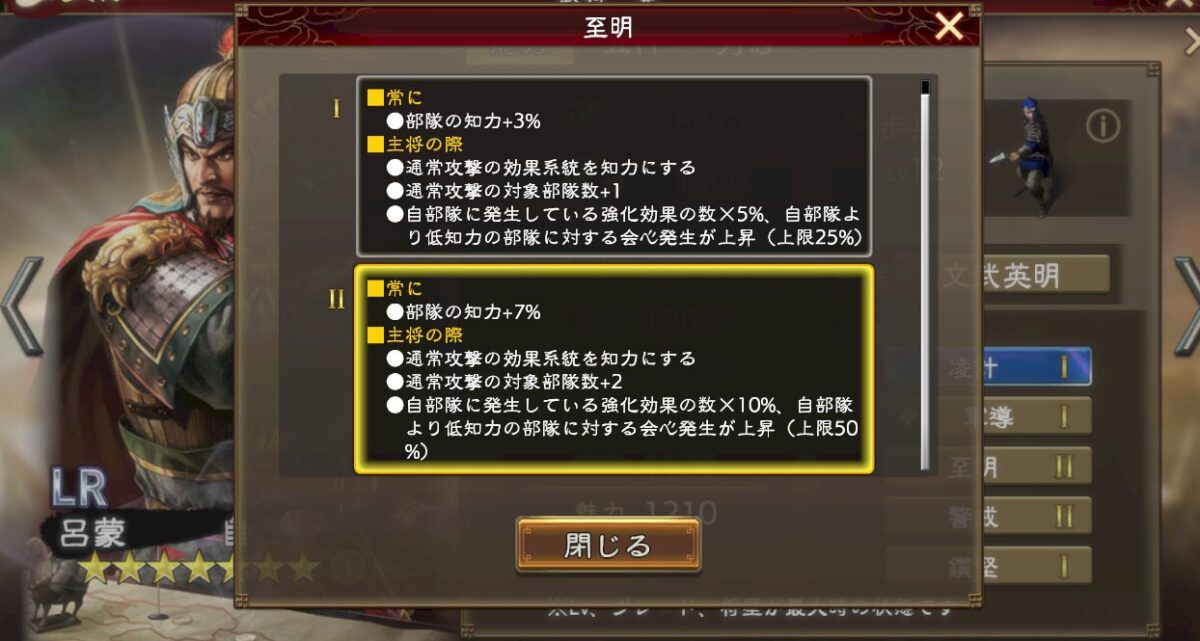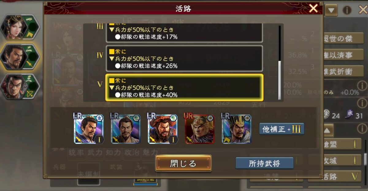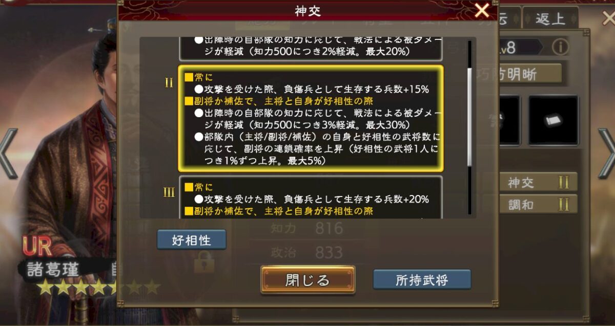 副将や補佐でも効果は発揮するのですけど、主将侍従に配置すると軽減率が倍になります。更に戦法発動時、戦法範囲を狭くしてくれます。