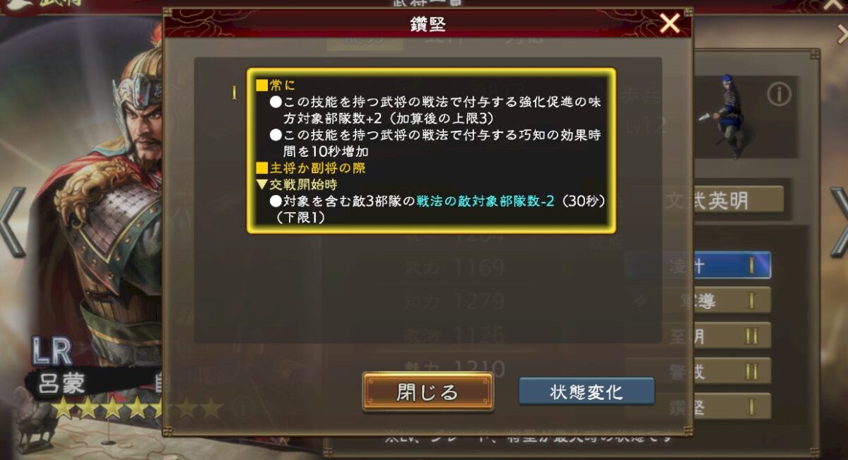 呂蒙はこんな感じで、交戦開始時戦法範囲低下を持ち、知力広範囲攻撃が可能な武将。