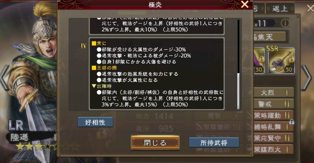 また陸遜ですが、星4+名宝で常時20%ダメ軽減と火属性軽減を持ちます。