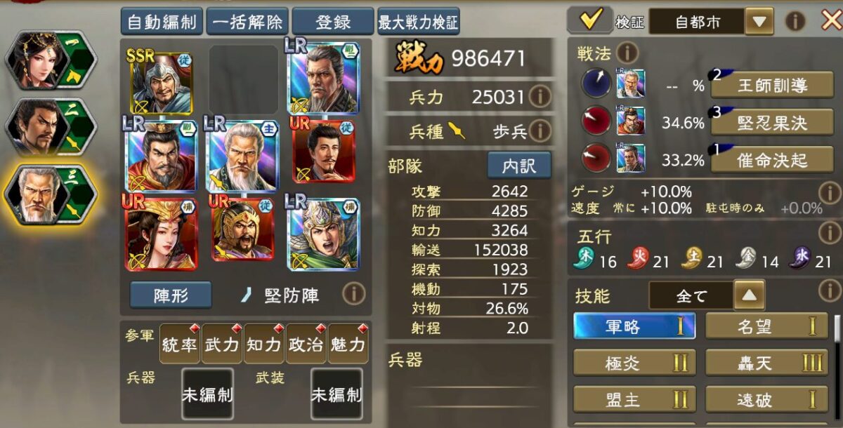 また主将が歩兵のためソンピンの技能「包囲」を生かす事ができず、結構苦しい。逆に言えばソンピンの星4や名宝がないなら、こっちの方が良いのかもしれない。