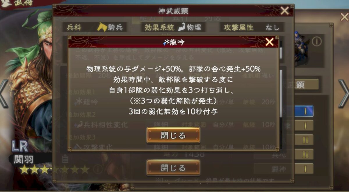 関羽の持つ有利変化は、龍吟、全兵科有利、の二つになります。
