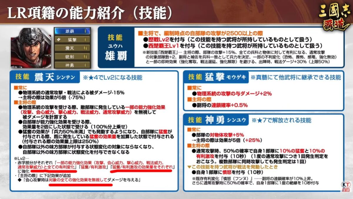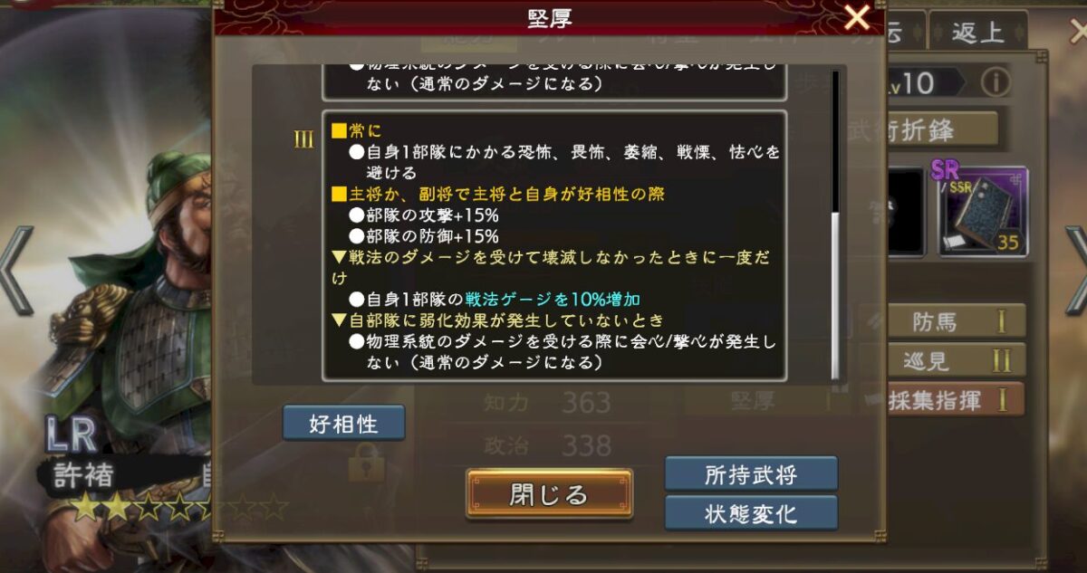 ちなみにですけど、火属性化は有利変化なので、項羽が星4以上の場合は「戦法が火属性化している」ことがなかったことになっている筈なので、「火属性の戦法で撃心が発生するようになる」の部分は適用されない筈です。