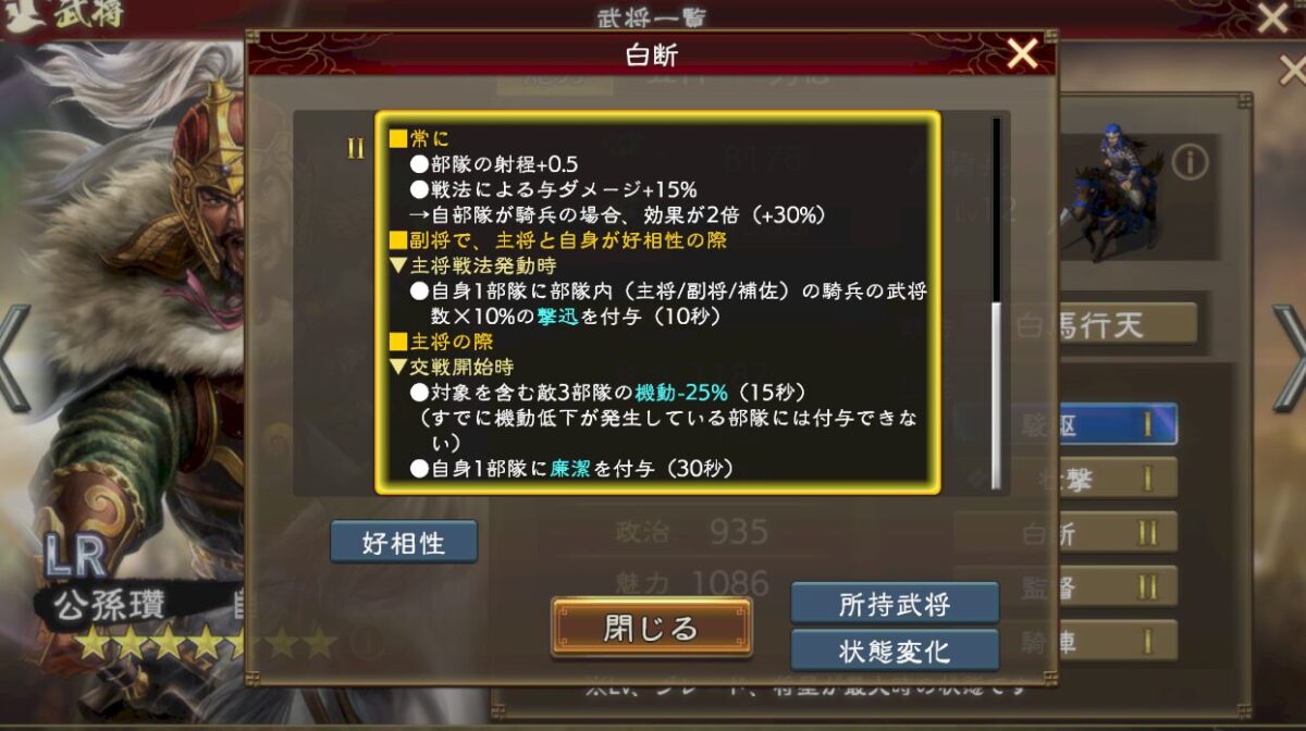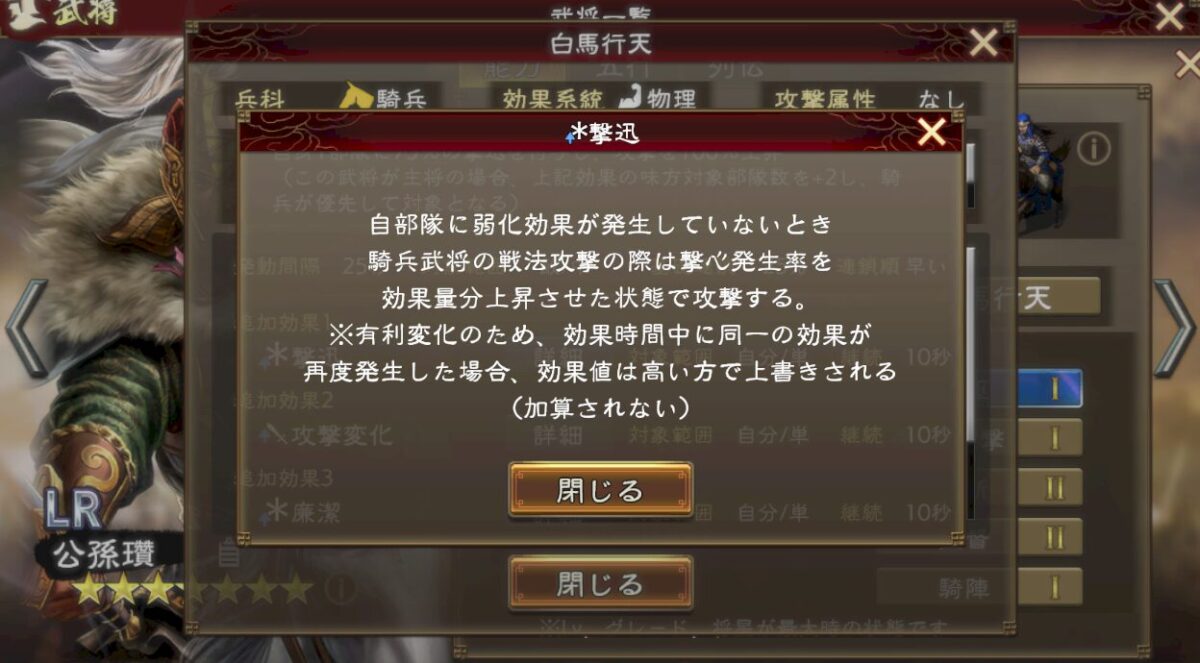 例えば関羽の副将で使われているかもしれないLR公孫瓚なのですが、これも撃迅という有利変化(能力変化ではない)の効果で撃心発生率を上昇させてきます。