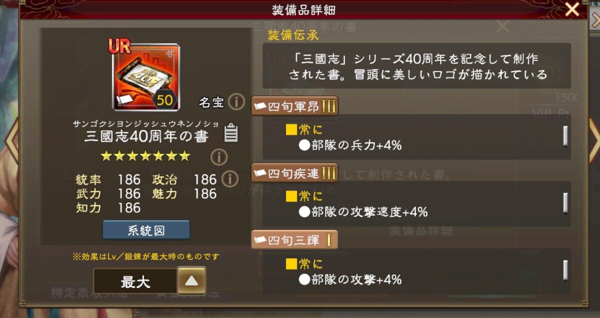また何気に統率、武力、知力、政治、魅力の全てのステータスが189上昇するという、非常に珍しいステ上昇の特性を持つ名宝でもある。