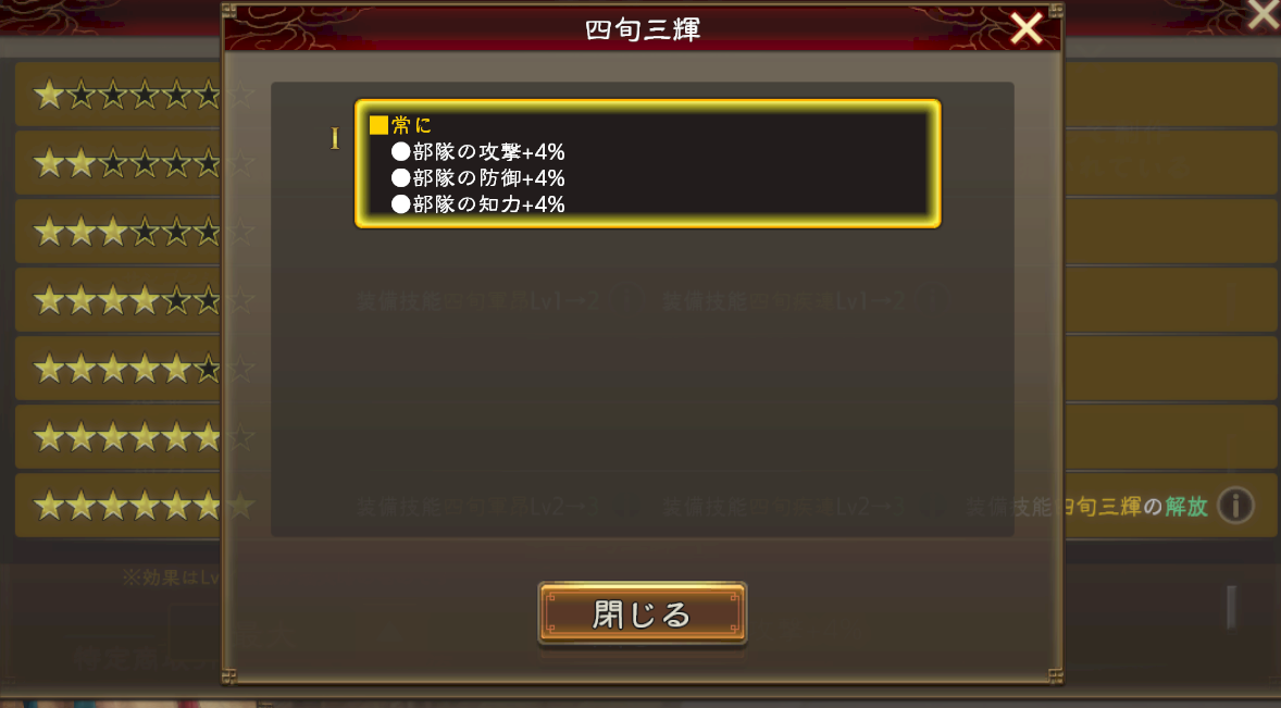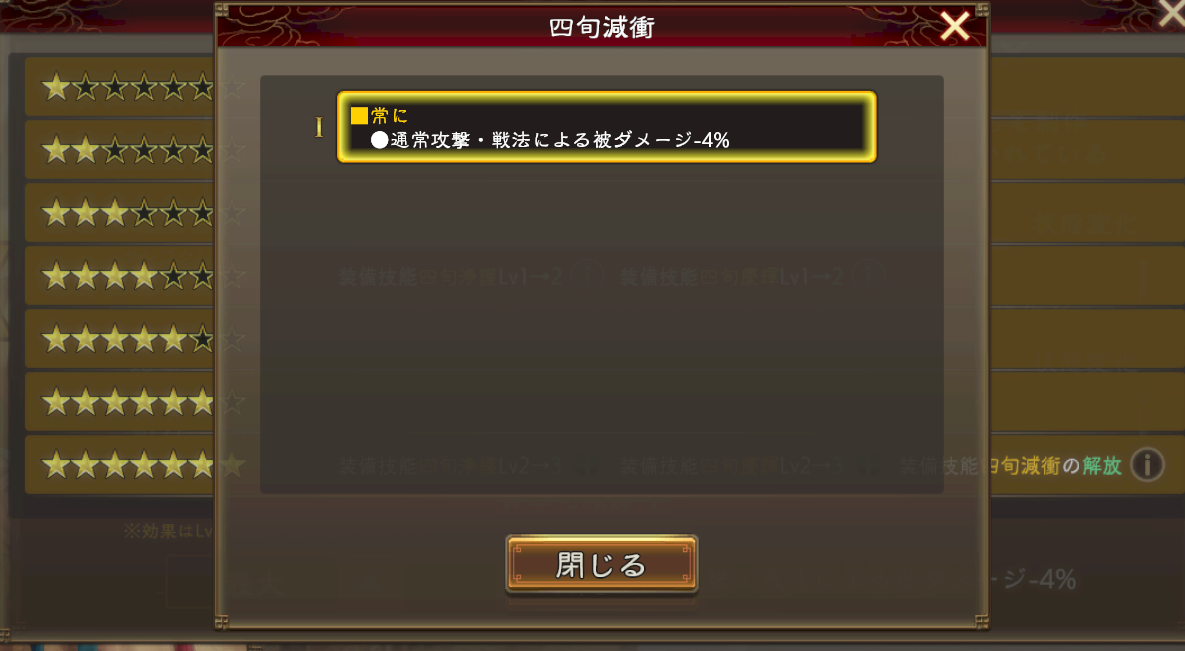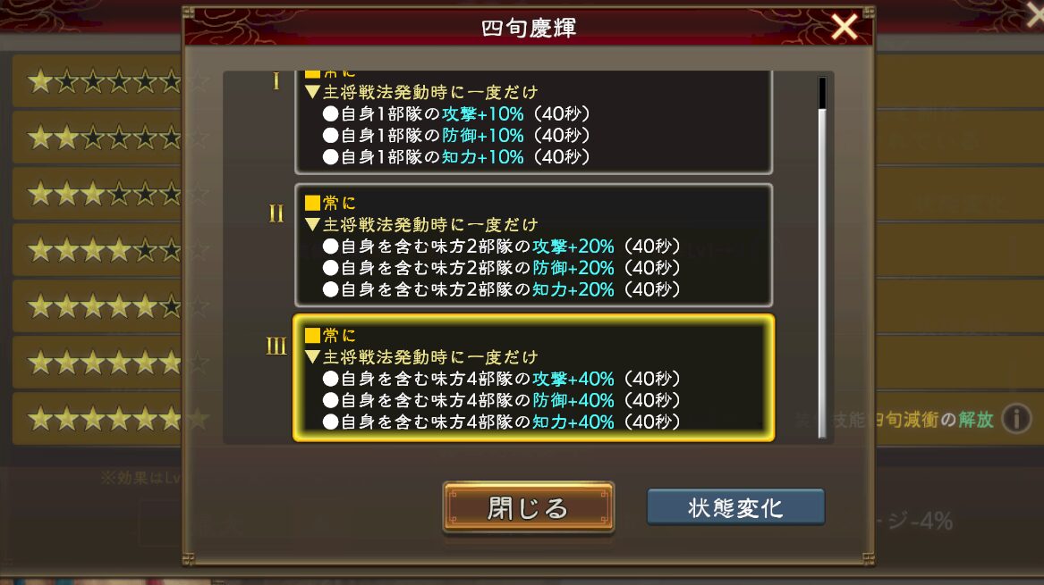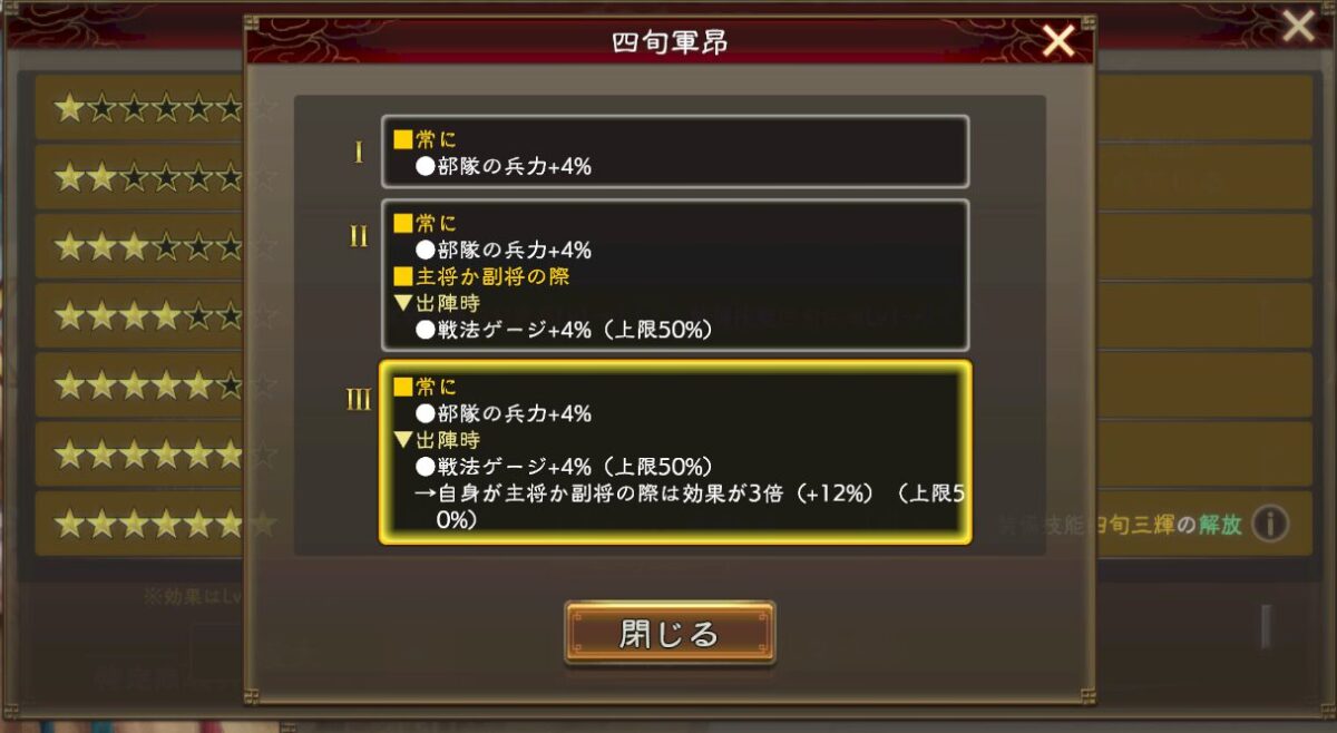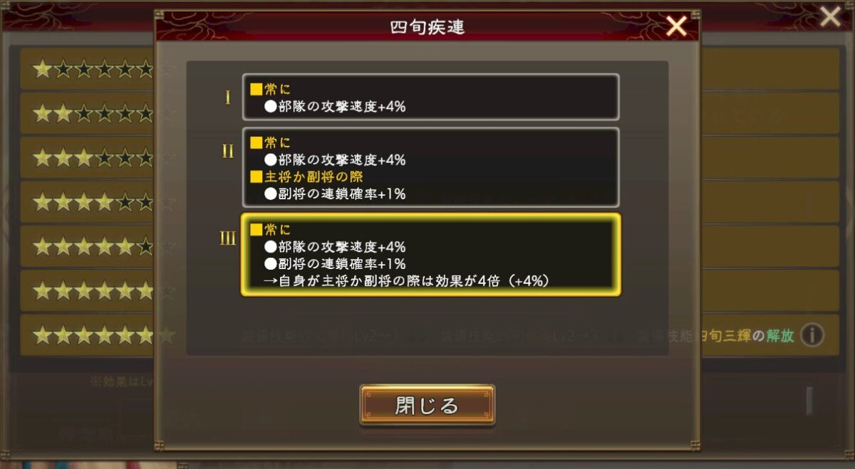 技能レベルが3→4に上がれば、通常攻撃時のデバフ付与発生率が50%→100%に上昇してます。他には副将連鎖時の知力バフが1部隊→3部隊になってる感じでしょうか。