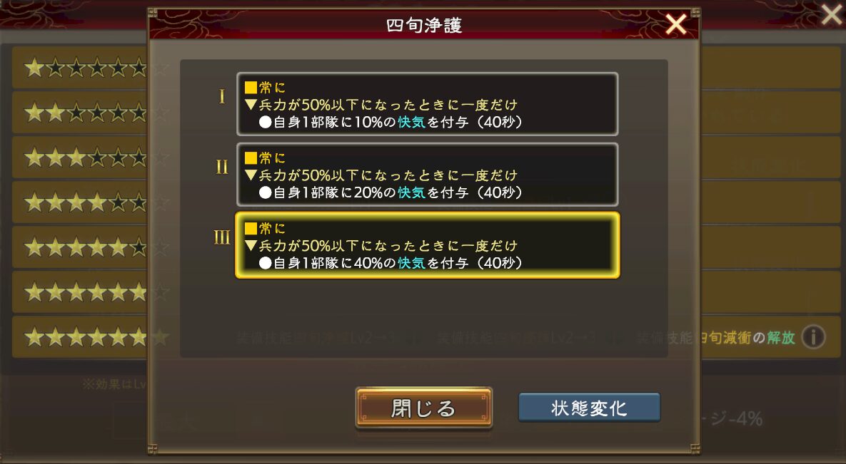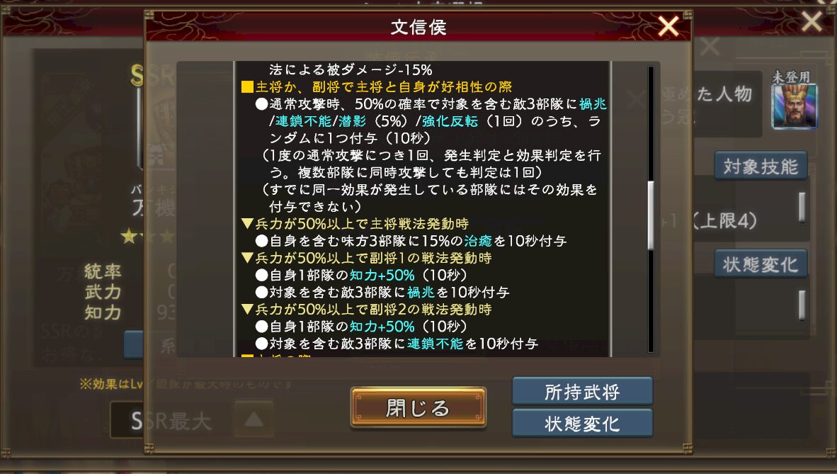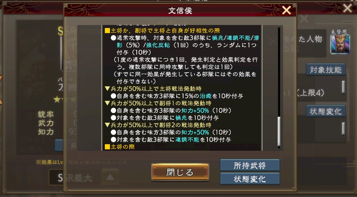また兵力50%以下の際に快気が発生することや、主将戦法時に4部隊40%のバフが40秒(こっちが重要)発生することで、バフリレー的な意味で使いやすい。戦法や通常ダメでの被ダメ軽減も無難に嬉しい。