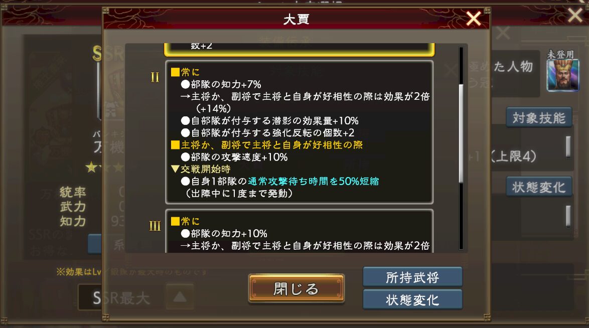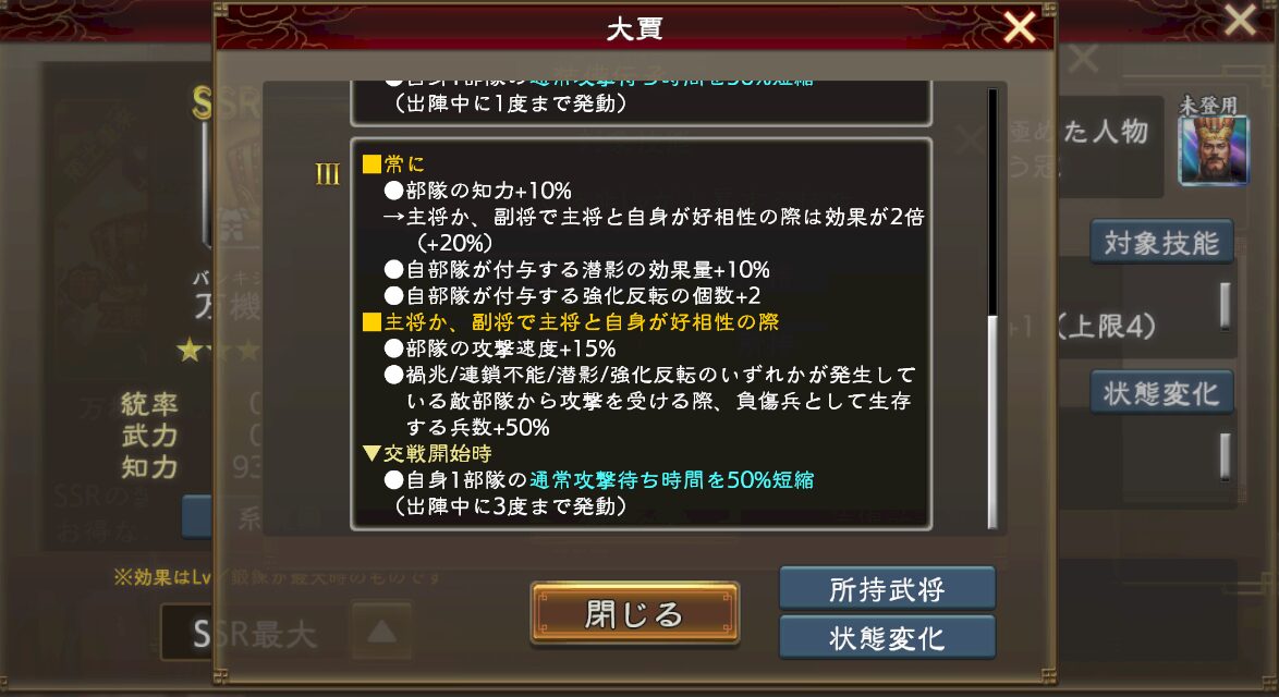 筆者が三國志覇道を始めた頃ってUR司馬懿が実装したぐらいの頃で、要するにSSR武将ってもう使われなくなってました。そして通常攻撃待ち時間短縮ってSSR劉備しか備えていない能力で、要するにこれ使われた事もないし、自分で使おうと思った事もない効果なんですよ。