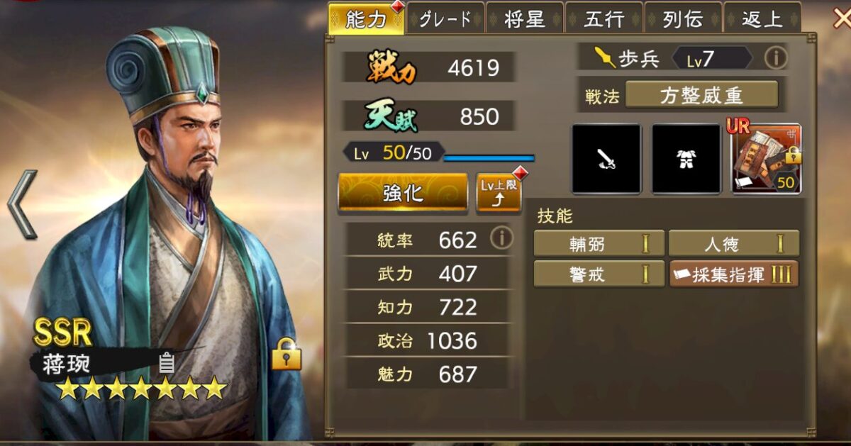 SSR蒋琬の内政を上げるのに使えたり、魅力、統率、政治などを部隊ステータスに加算する系のブースターとしても機能する。個人的にはSSR蒋琬の最強の相方になれると思う。旗が配布なのはホントに嬉しい。