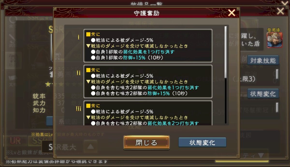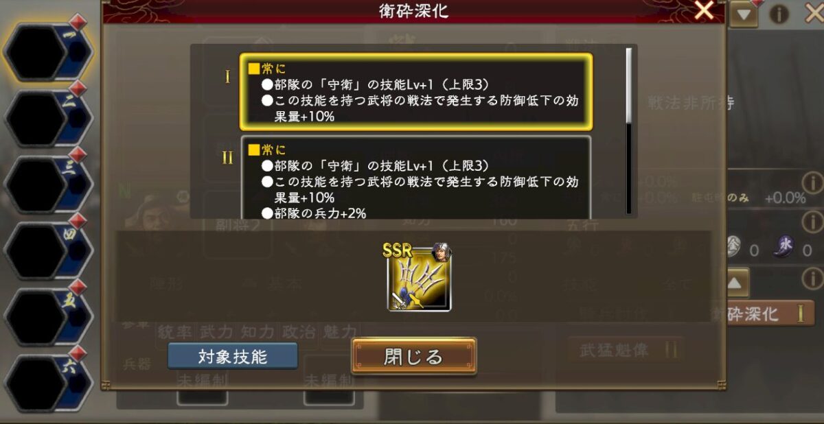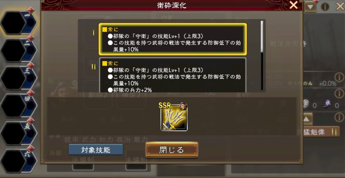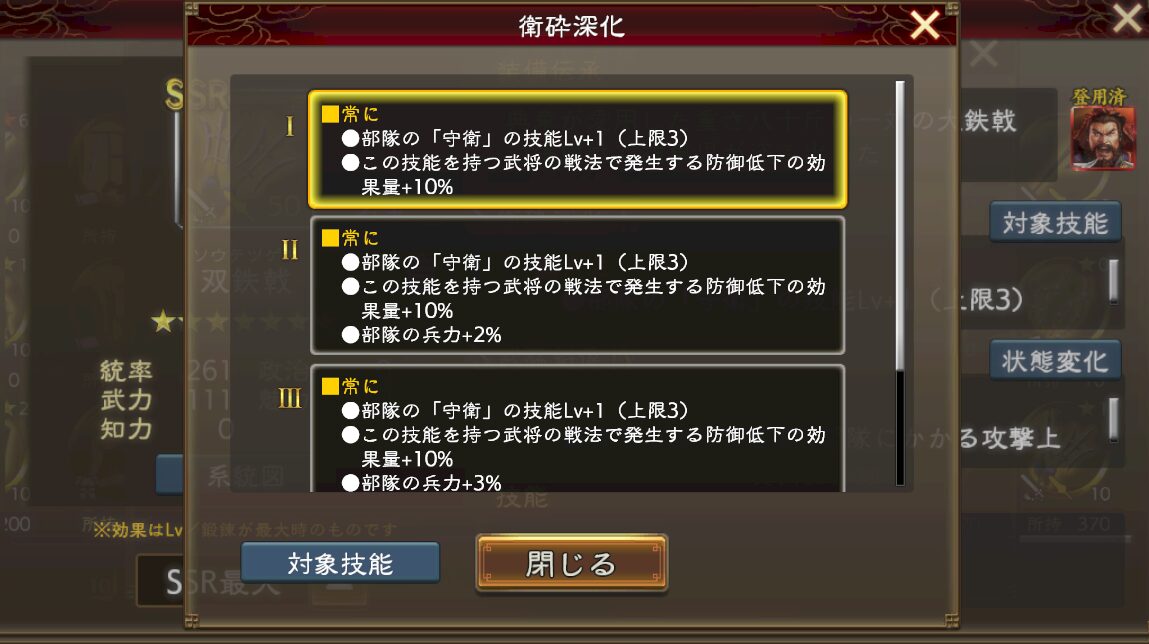 この技能(衛砕深化)の効果は技能「守衛」の技能レベル+1であり。この技能(衛砕深化)を持つ武将の戦法で発生する防御力低下の効果量+10%。という効果になります。