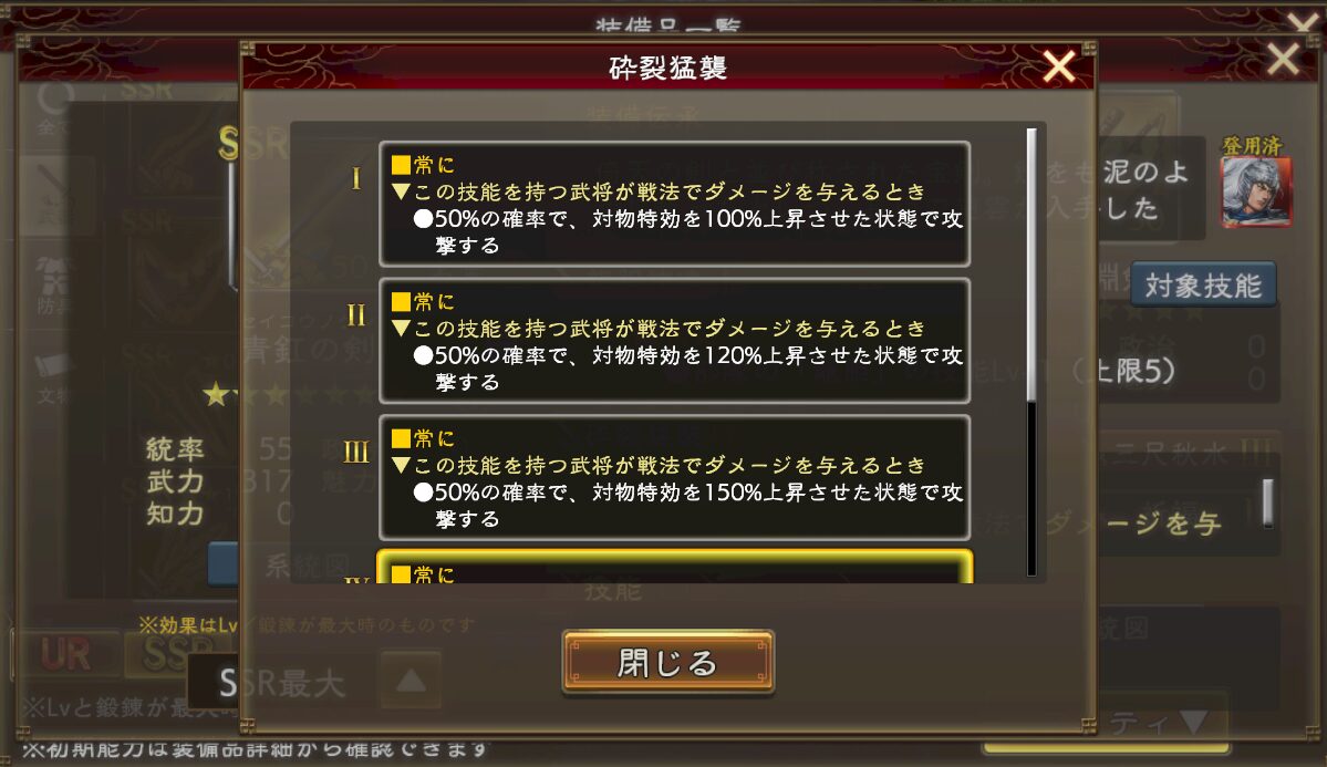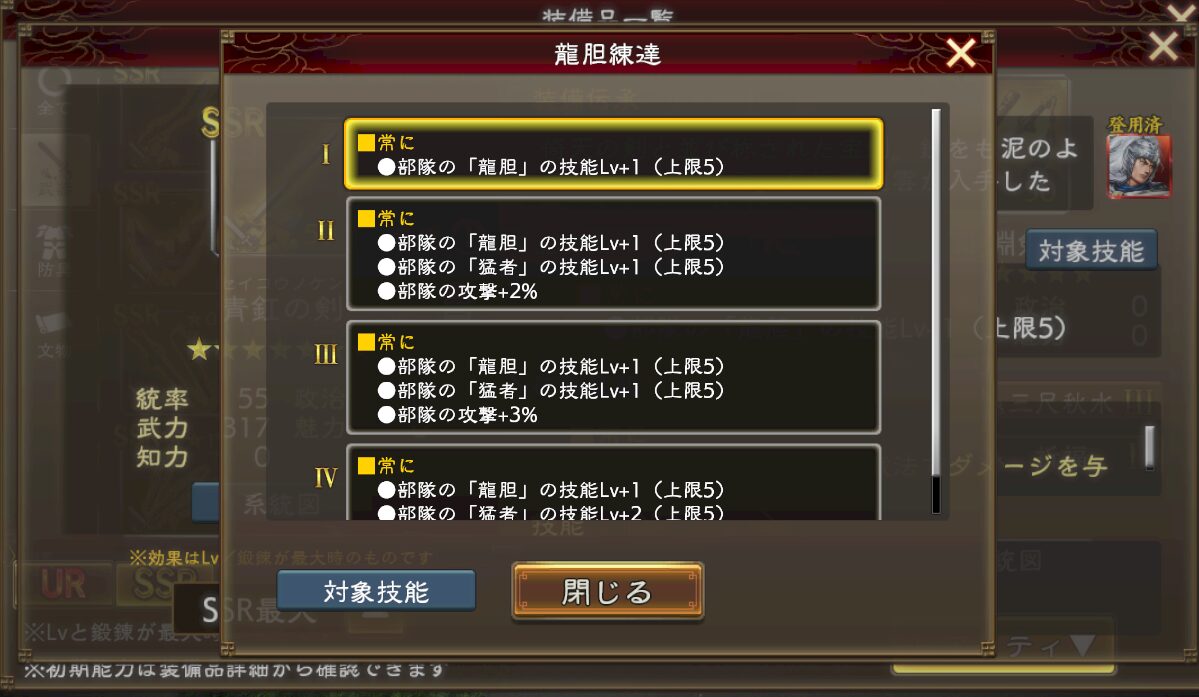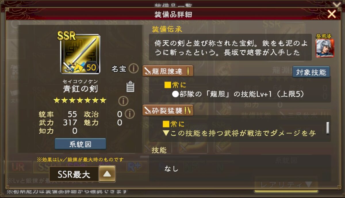例えば趙雲の剣は、「龍胆錬達」と「砕裂猛襲」の技能を持っています。