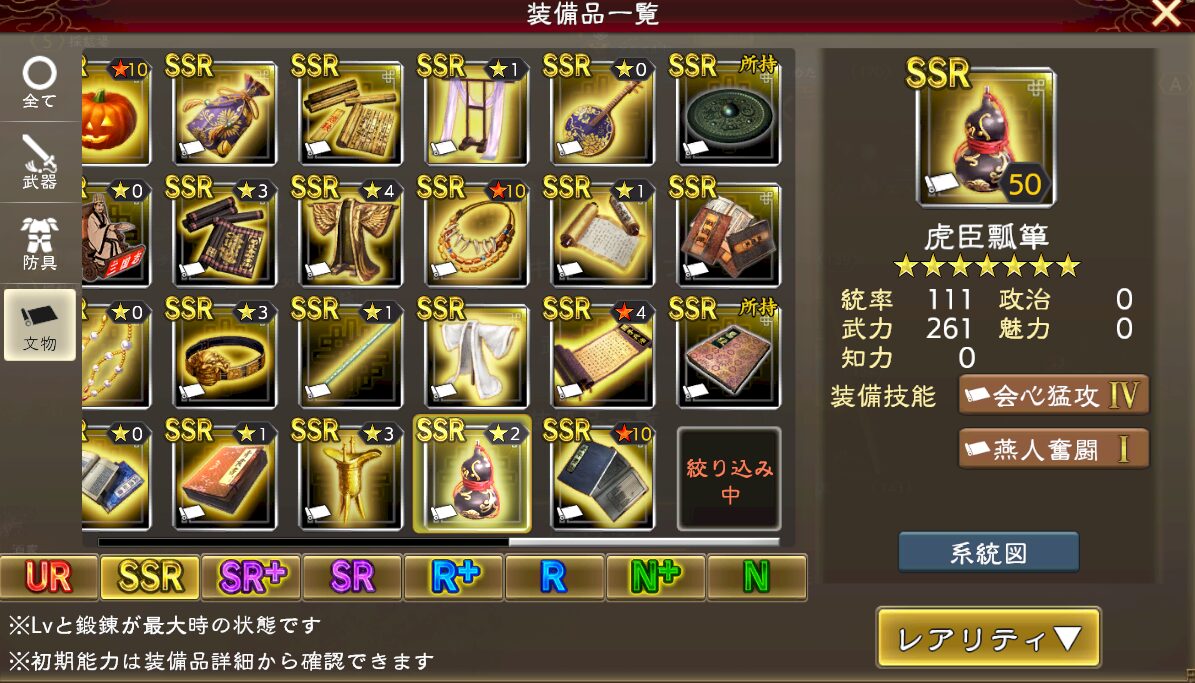 ただ、これなら「主将に袁紹武器+虎マント(防具)」と「補佐に袁紹防具」の組み合わせで、ゲージ20%増+袁紹の名宝2種状態を両立可能だったりもする訳です。