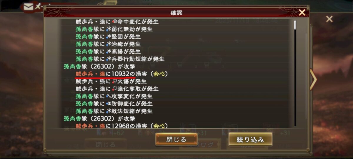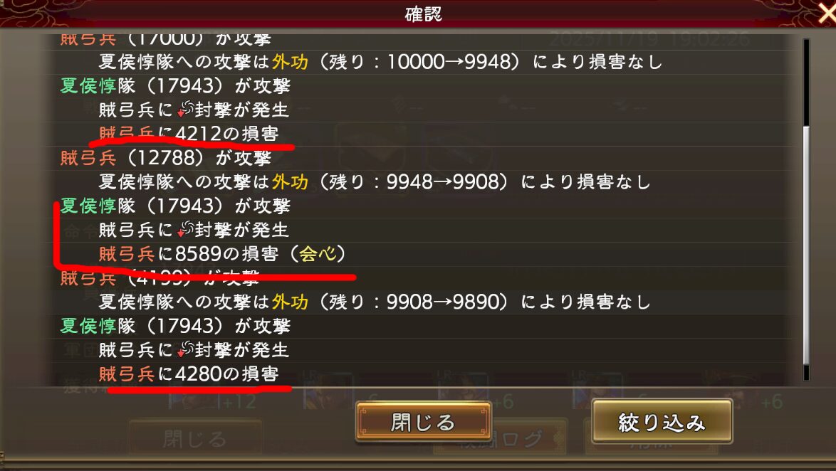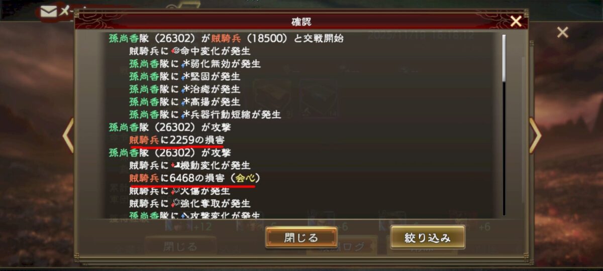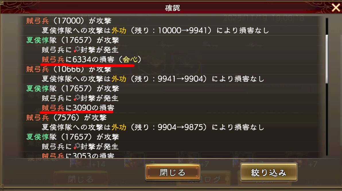 そして下のログでは弓兵で歩兵を殴ってる訳なので、与ダメ有利が付いてます(1.25倍程度)